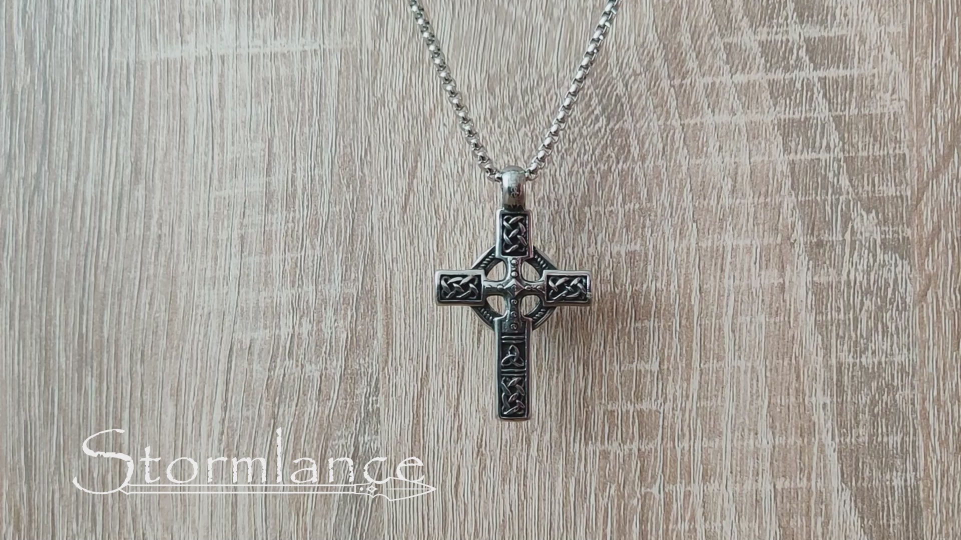 Celtic cross pendant with intricate details and Triquetra. The necklace is made of top-quality stainless steel, the design is both-sided and it will never tarnish.