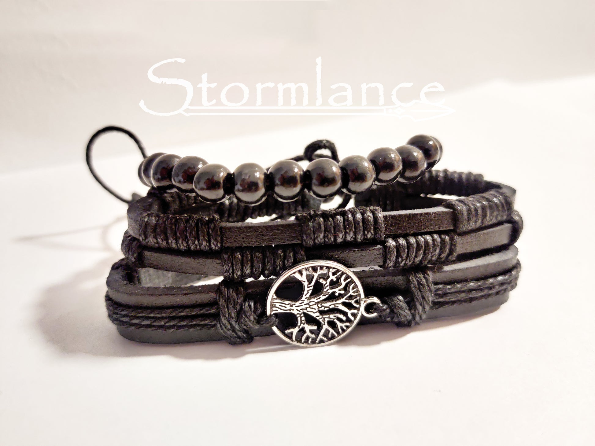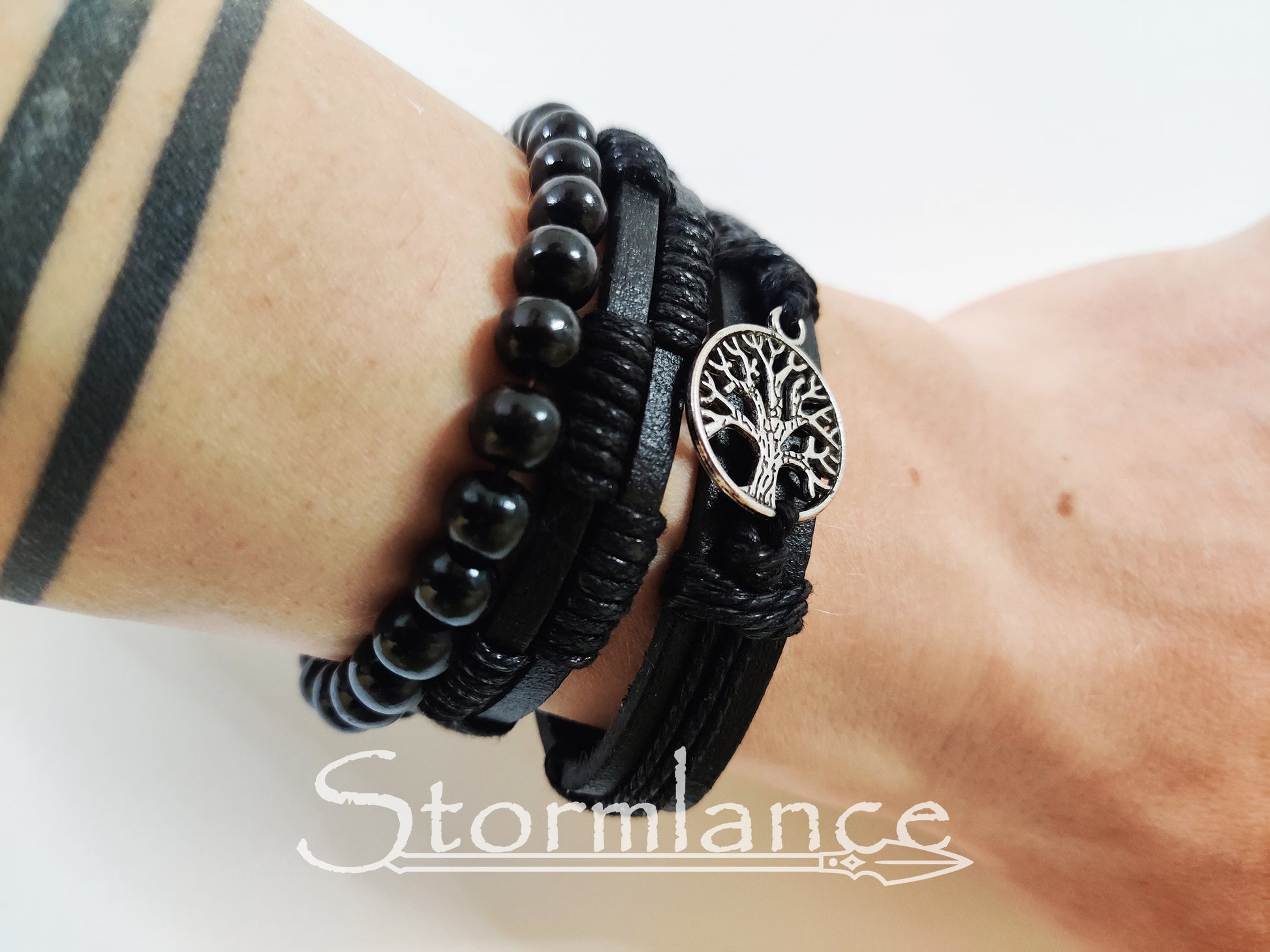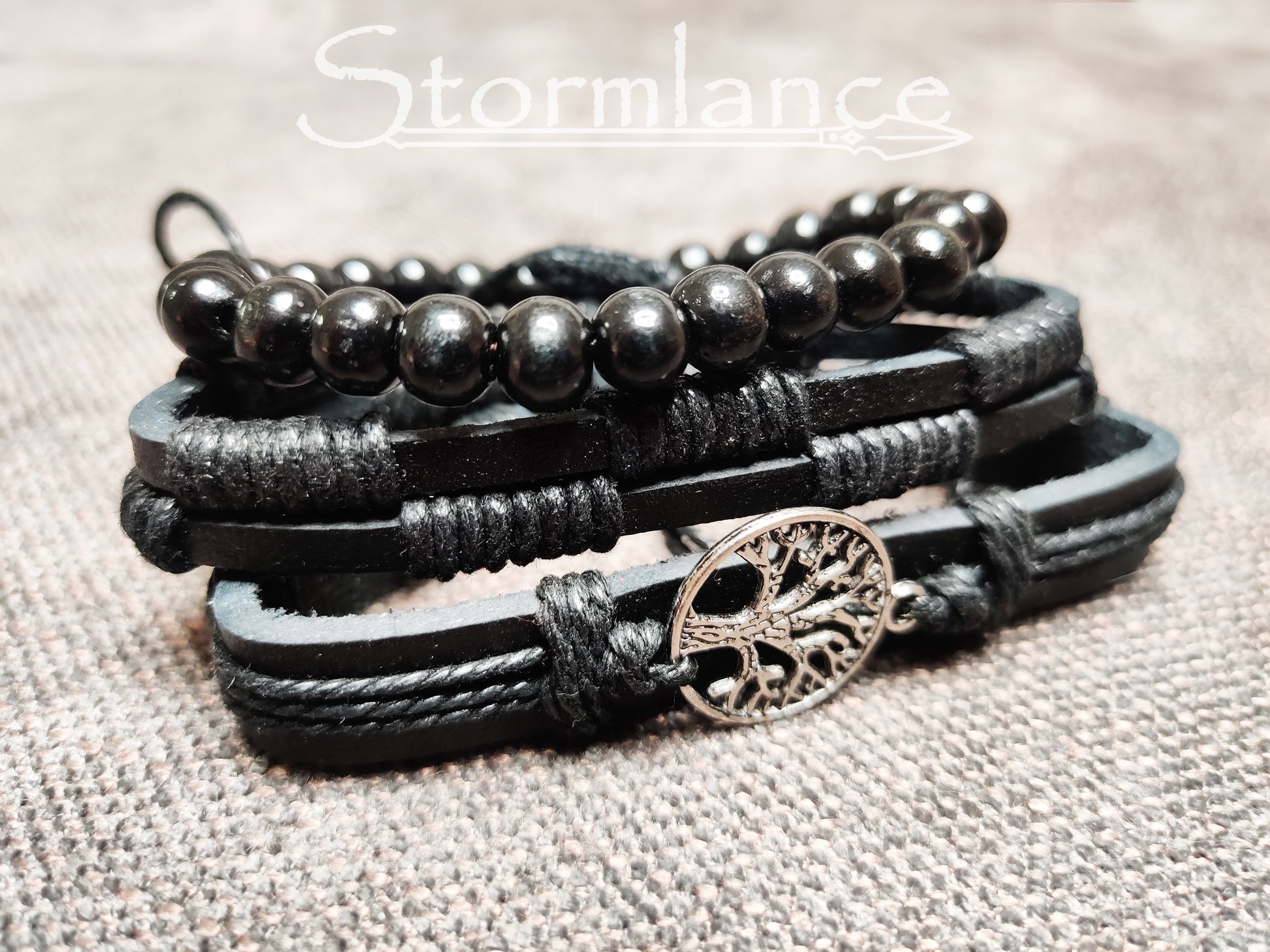 A PU leather three-part bracelet made of quality artificial leather (black variation) and rope. The Yggdrasil symbol is made of zinc alloy. The bracelet consists of three parts, but each can be worn separately as its own bracelet.