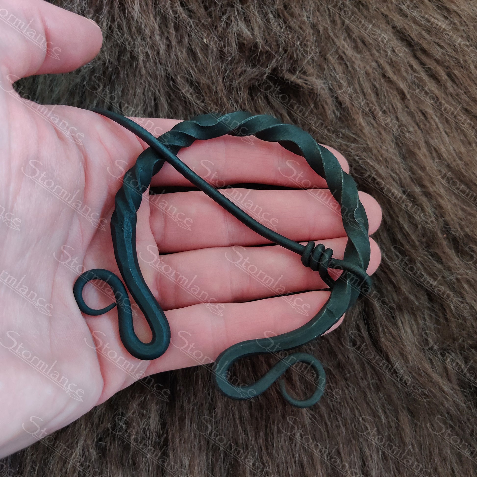 Embrace the artistry of Viking craftsmanship with this hand-forged aristocratic fibula. Made of wrought iron, it radiates an aura of raw elegance and strength. Historically used as a brooch or fastener, its intricate design pays homage to the meticulous skills of ancient Norse blacksmiths. The rich, dark tones of the iron lend it a timeless charm, making it both a functional accessory and a statement piece.