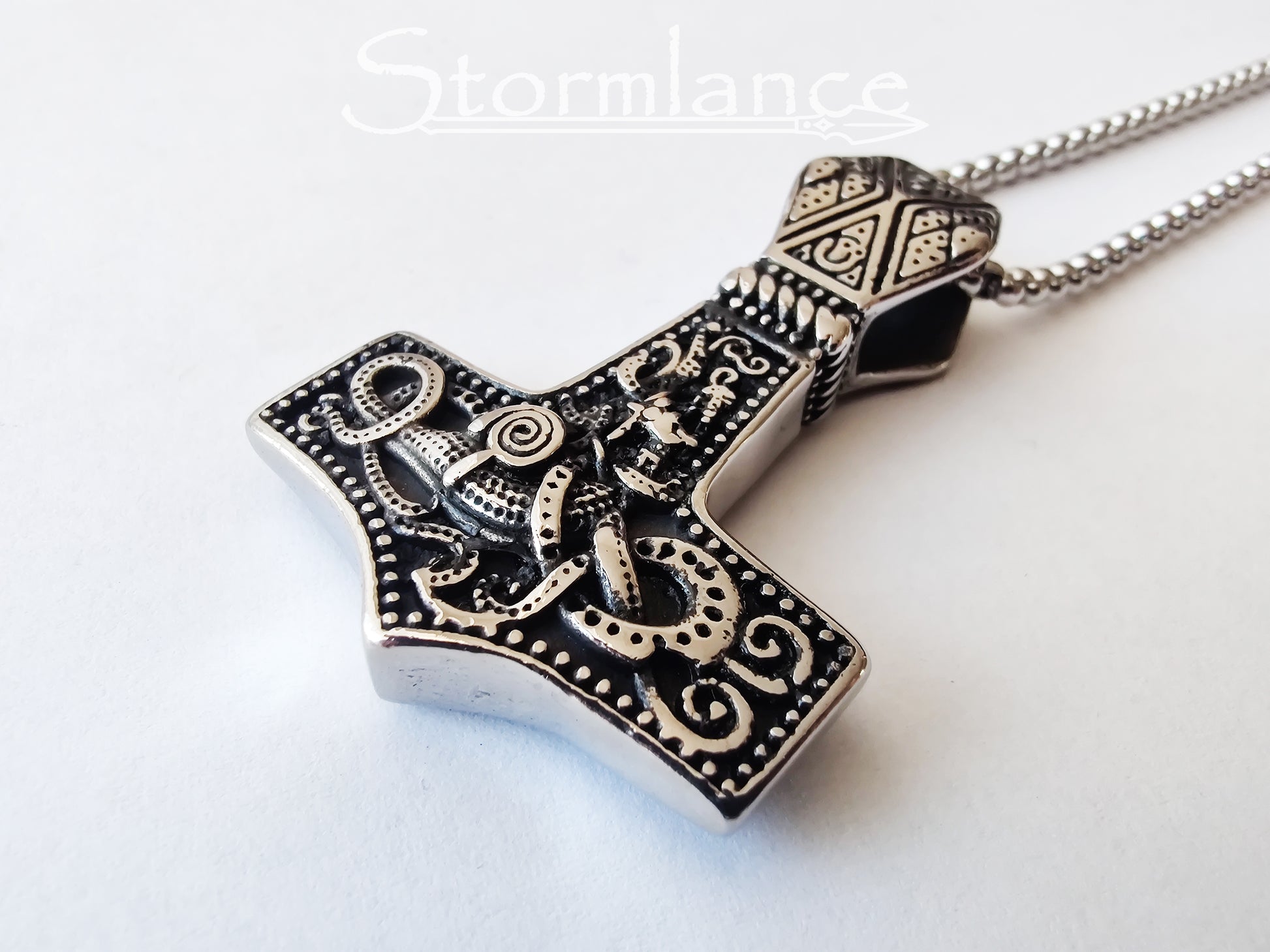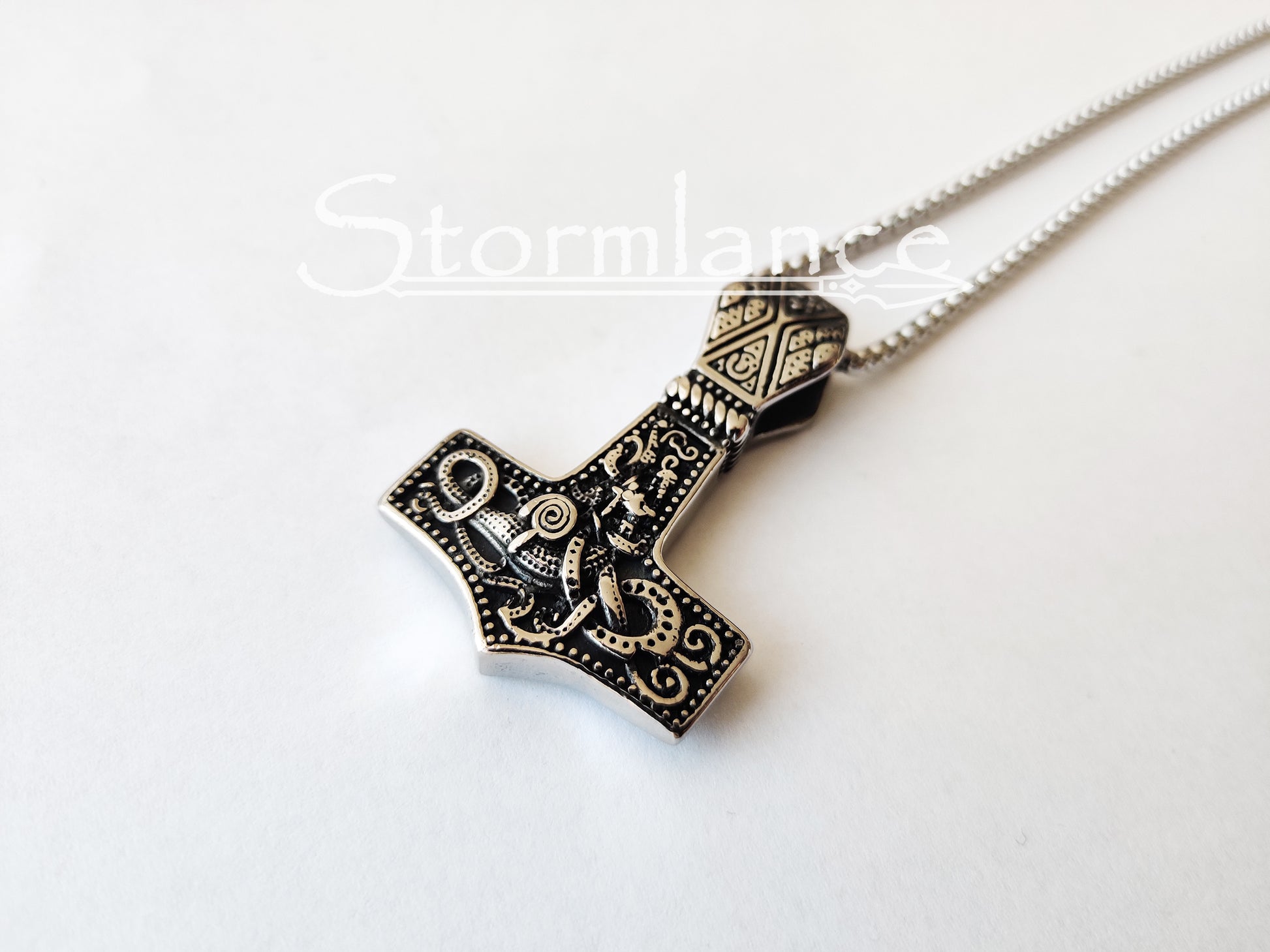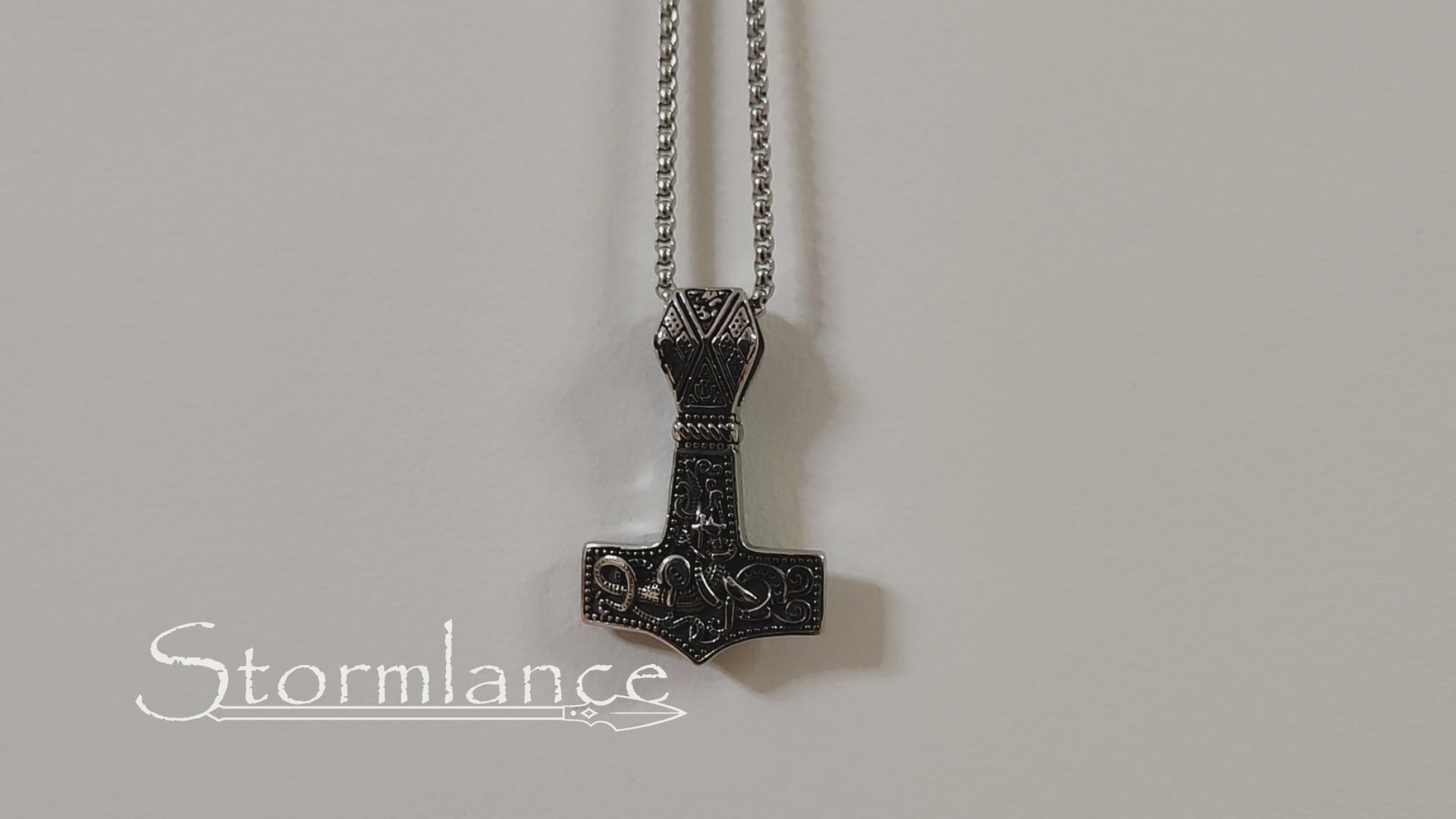 Uniquely designed Mjolnir (Thor's Hammer) with Scandinavian patterns. Made of high-quality stainless steel that will never tarnish.
