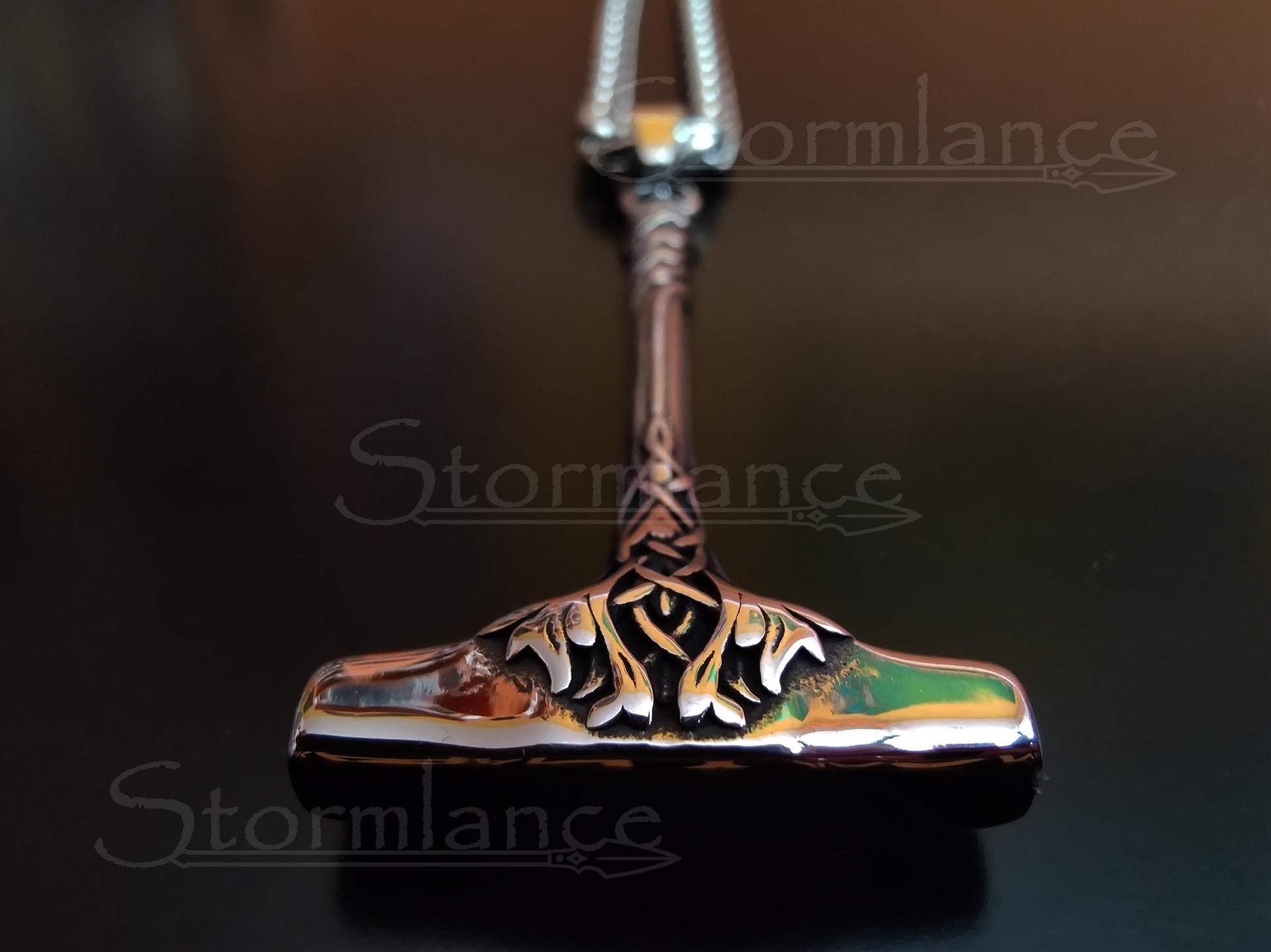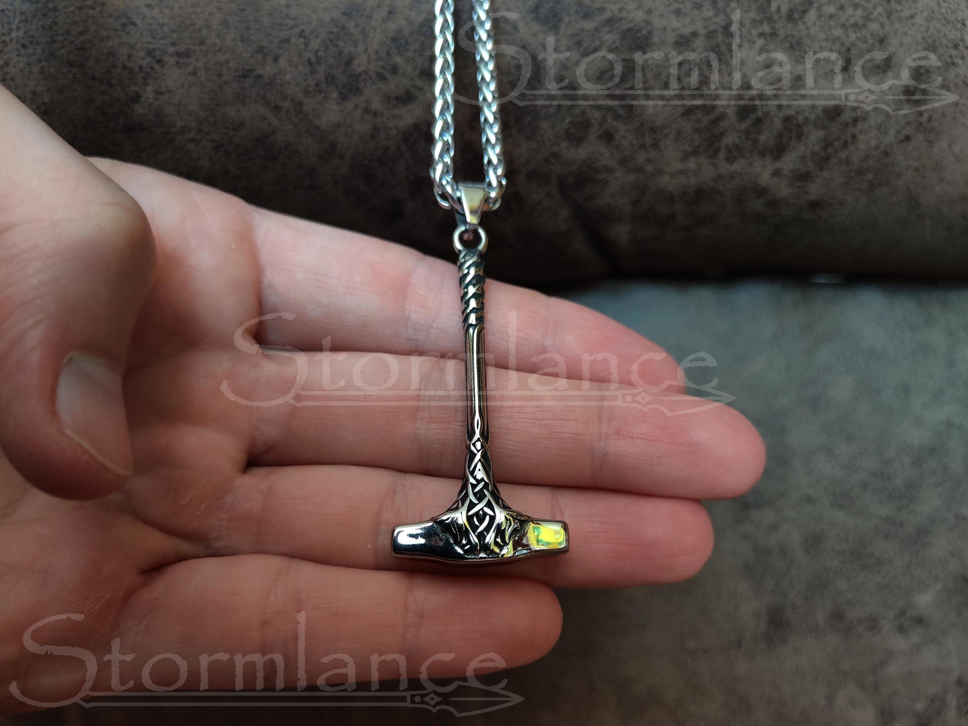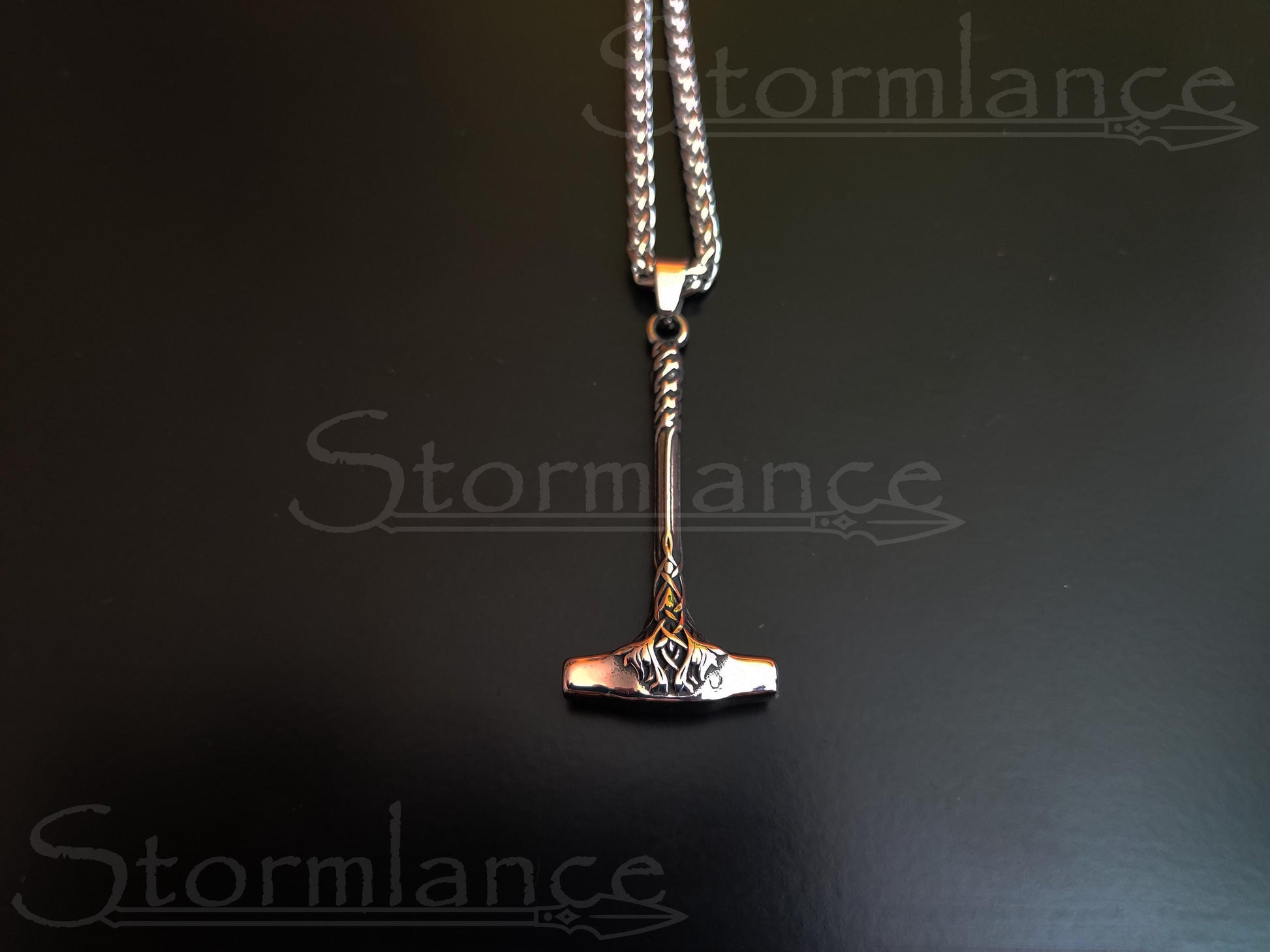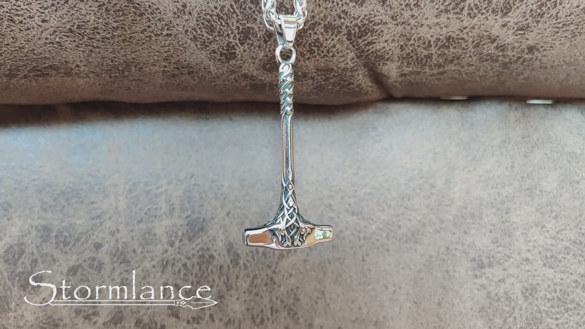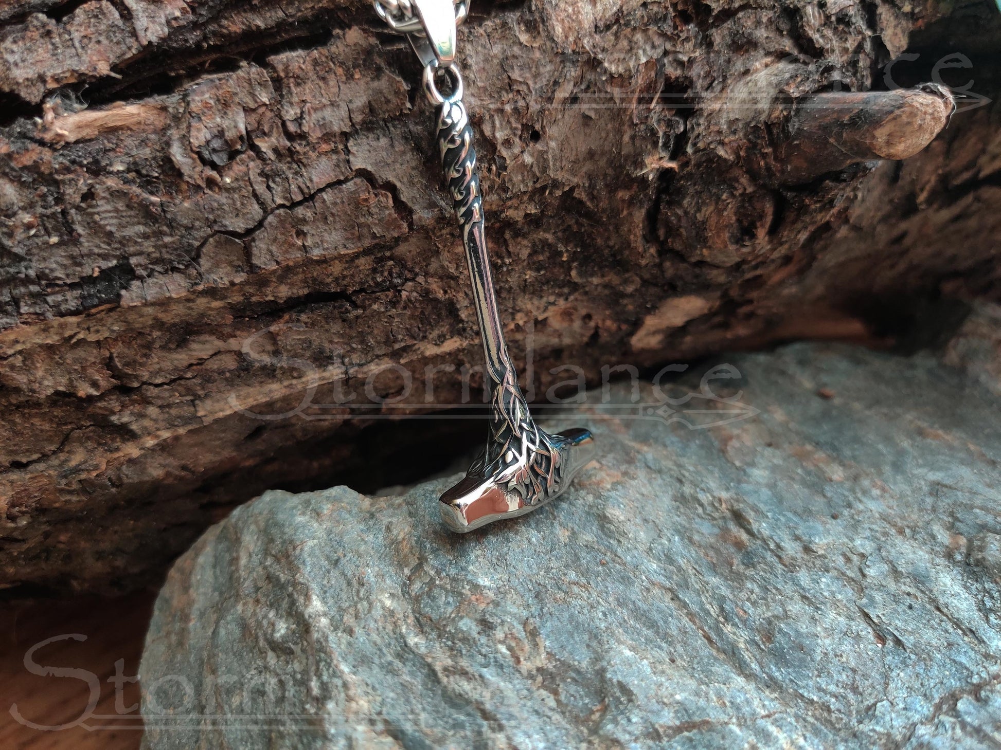A beautiful Mjolnir (Thor's hammer) pendant with a long handle and Viking patterns.