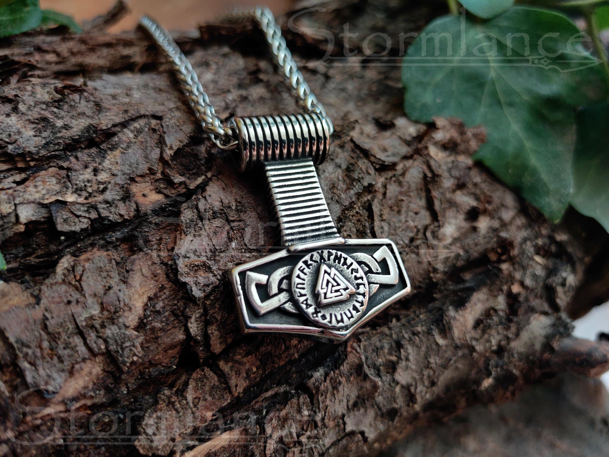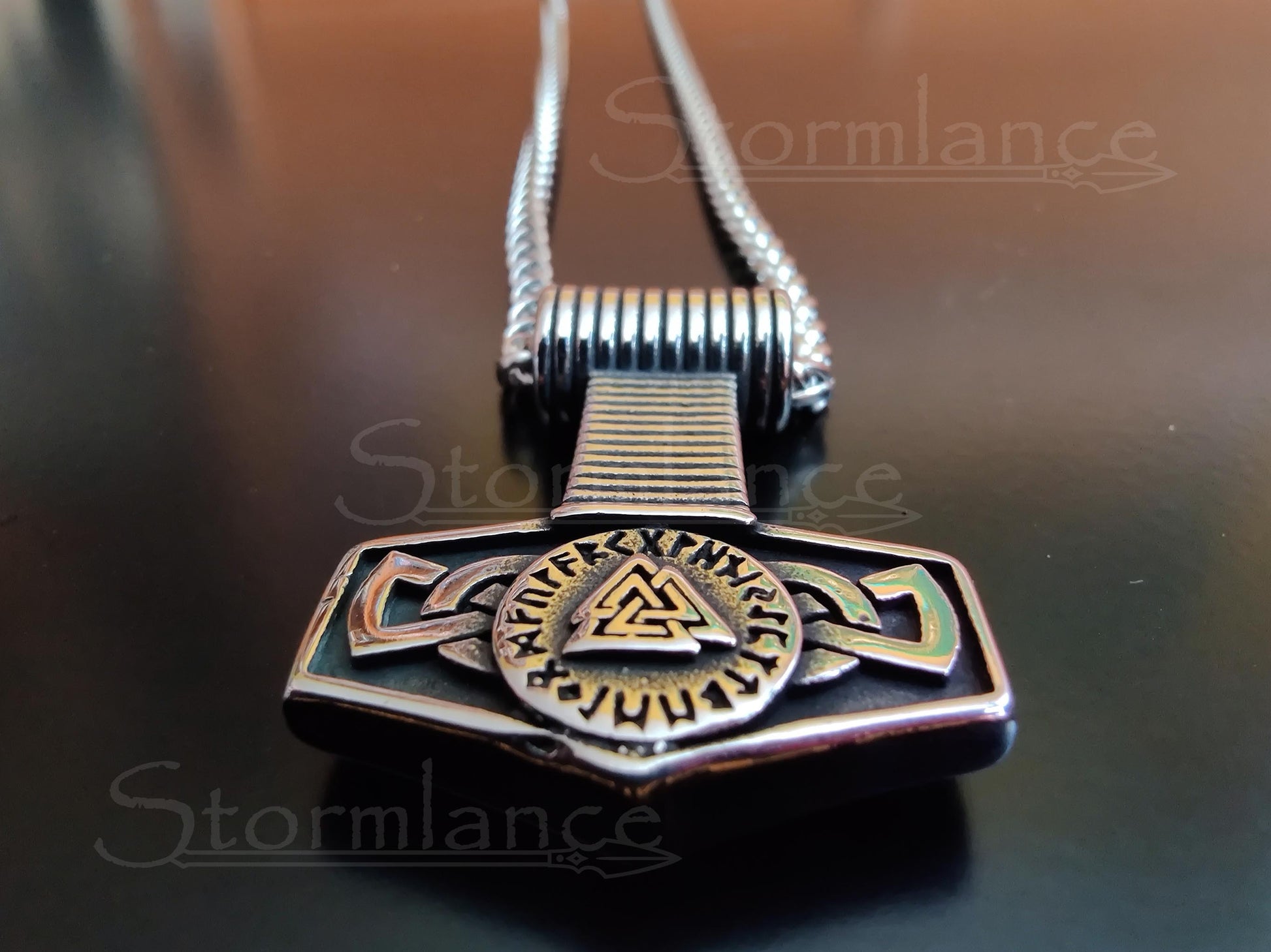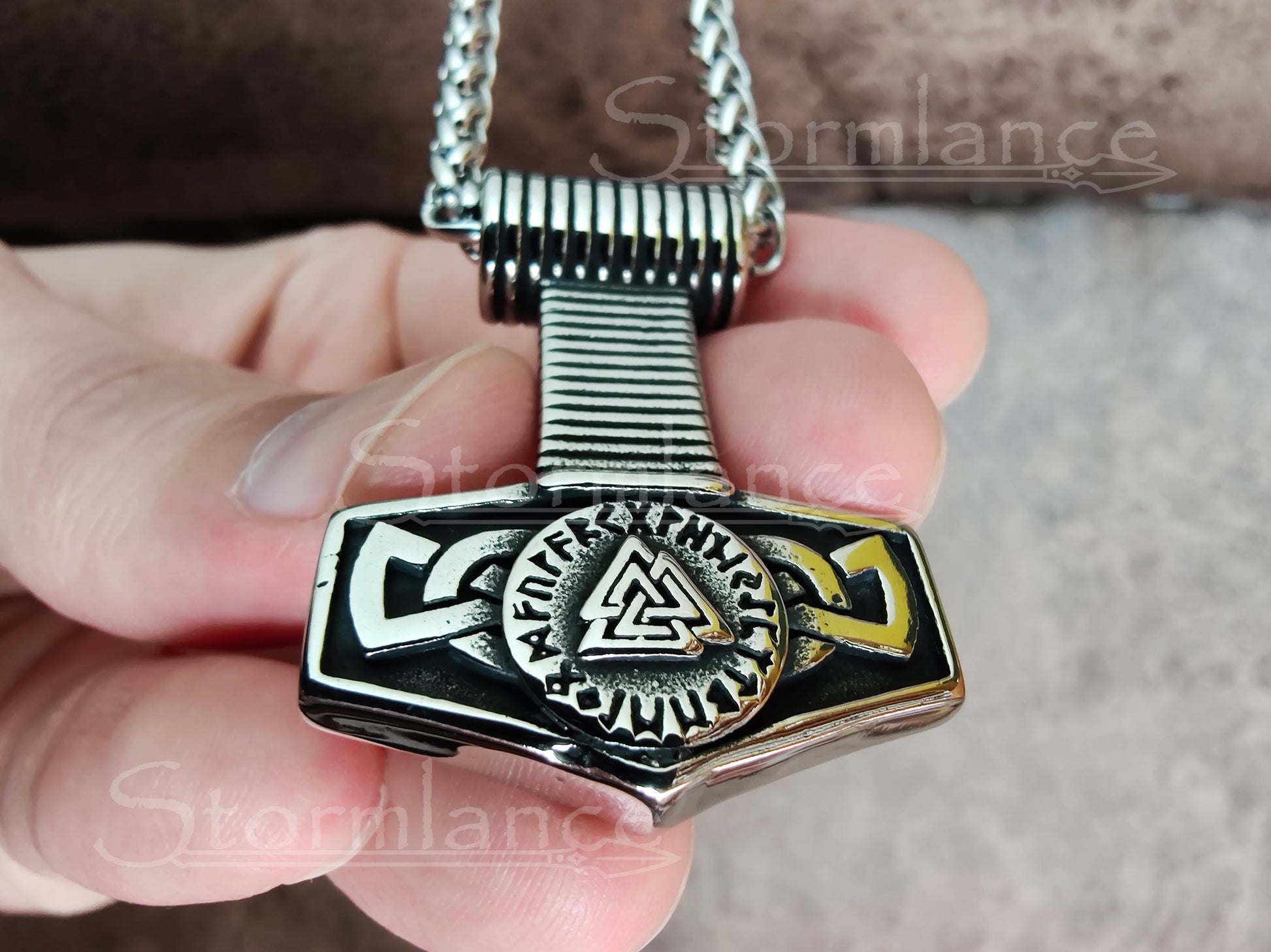 Heavy Mjolnir (Thor's hammer) pendant with Valknut and Norse Runes (Elder Futhark) in the middle.