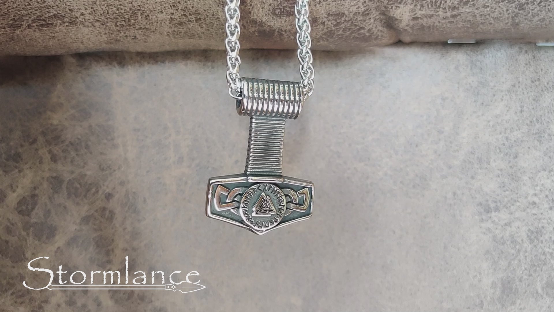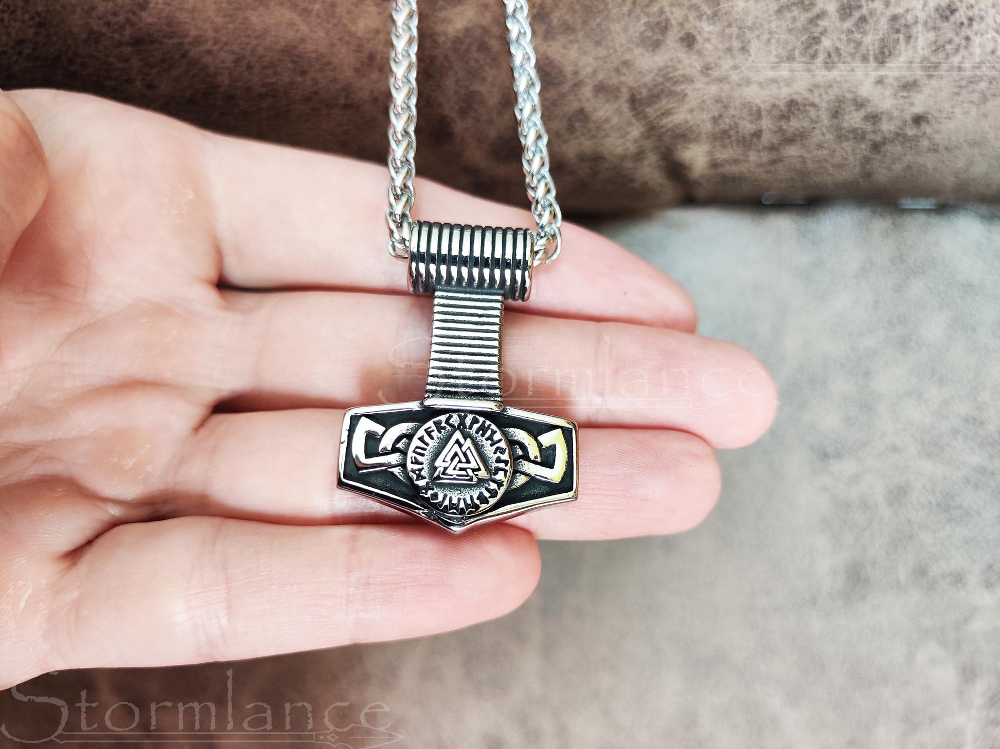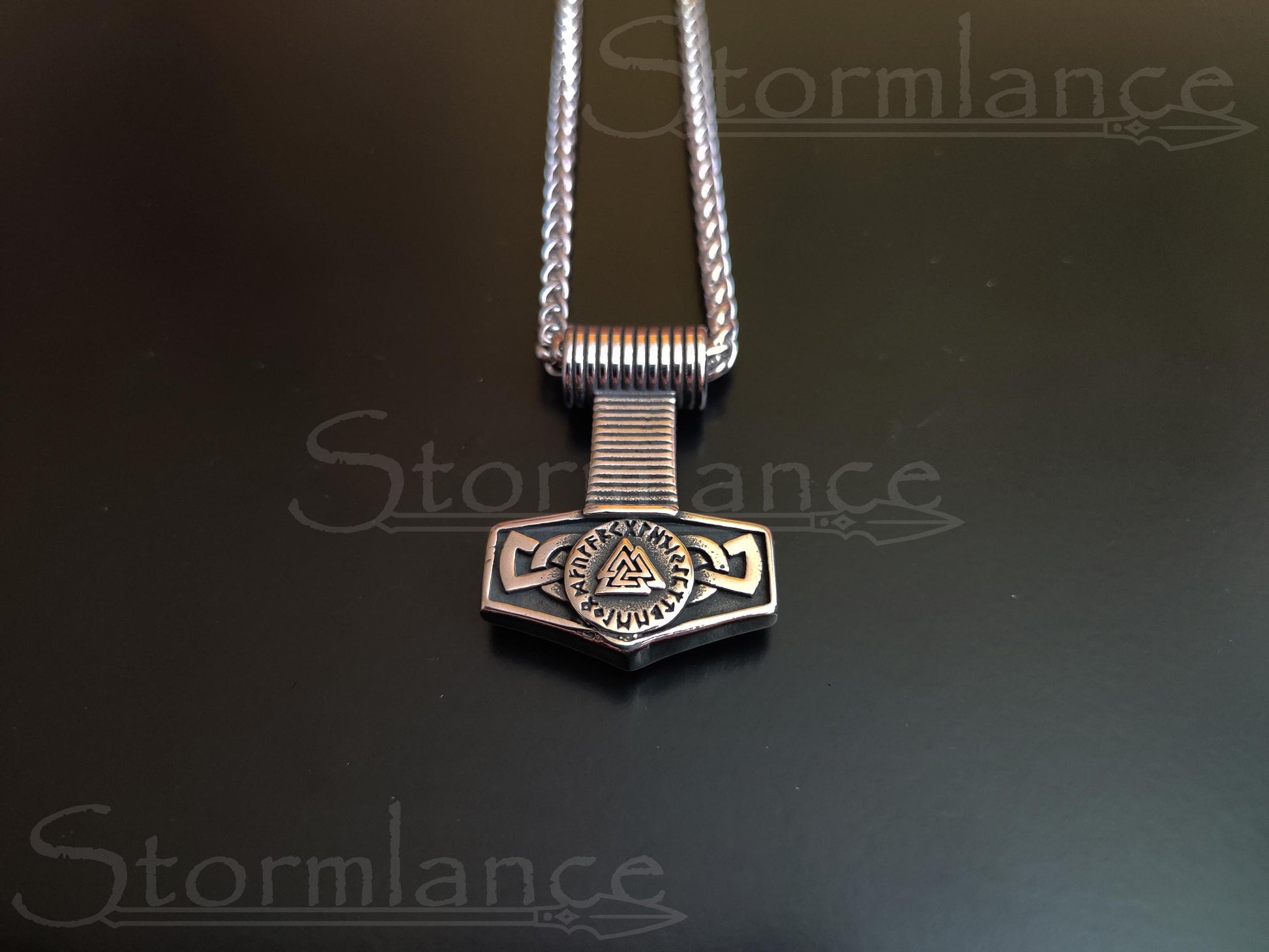 Heavy Mjolnir (Thor's hammer) pendant with Valknut and Norse Runes (Elder Futhark) in the middle.