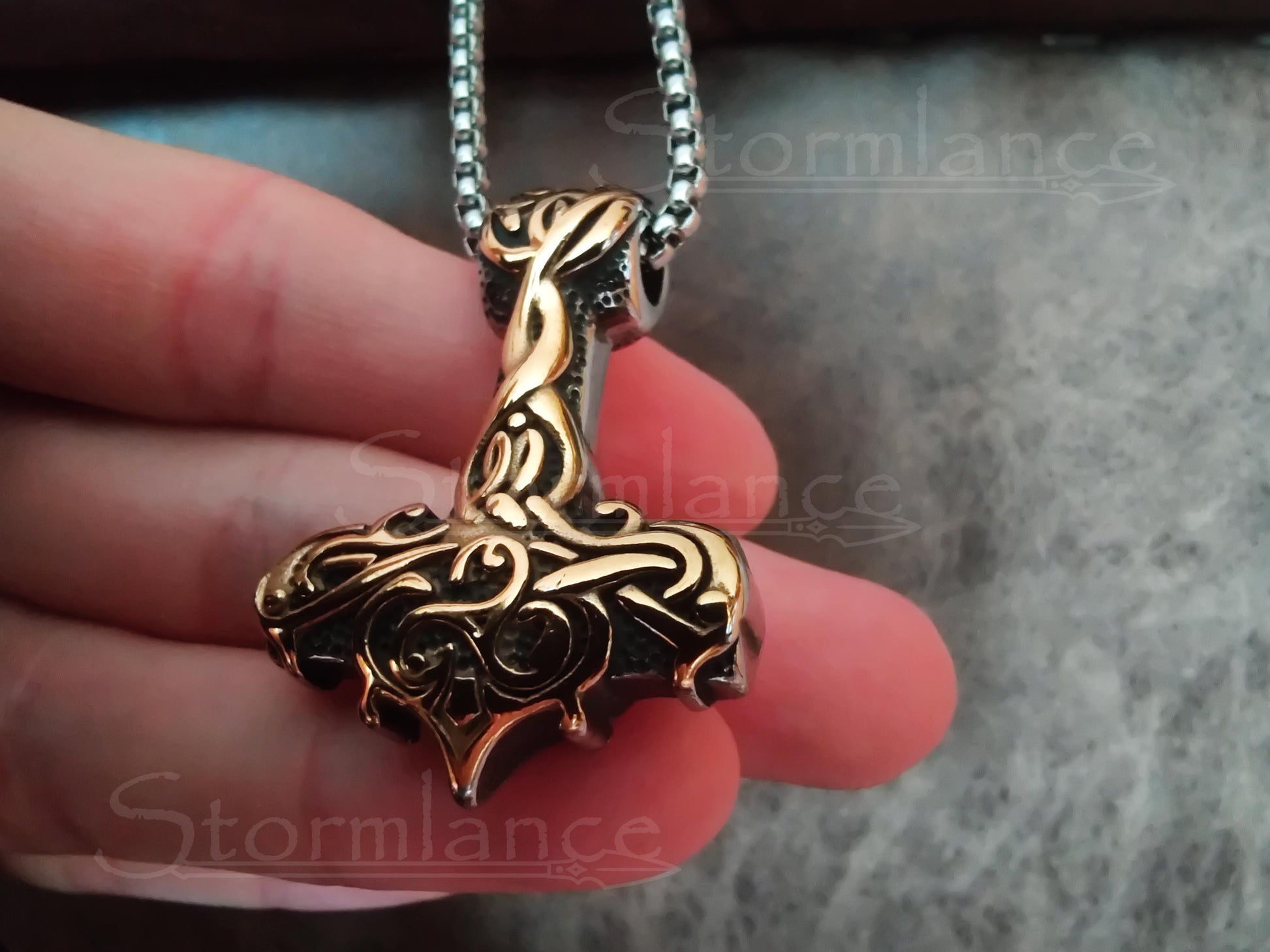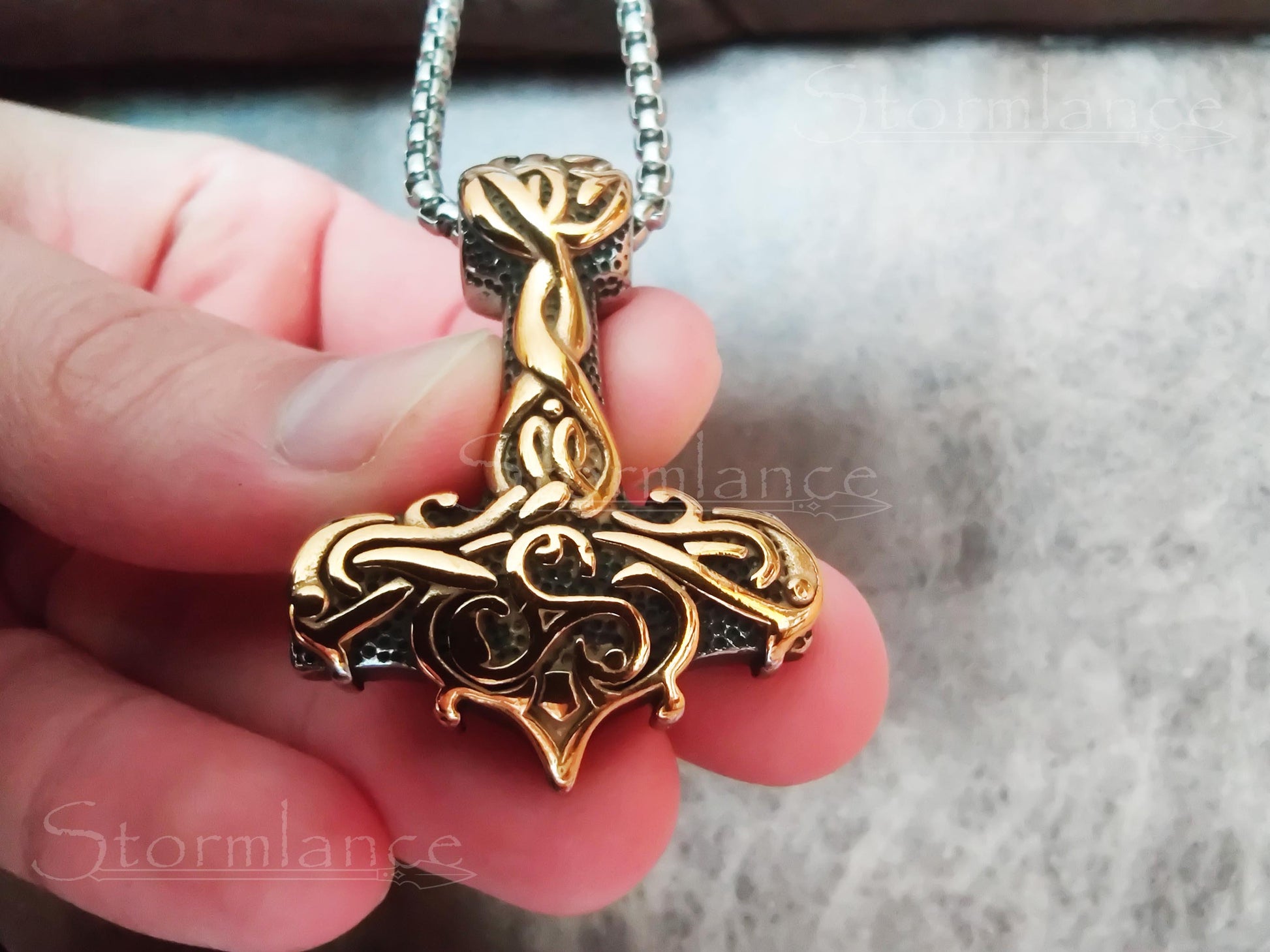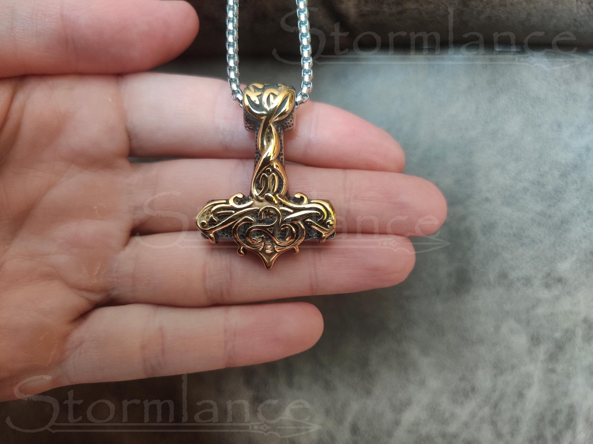 Behold the beauty of this magnificent Mjolnir pendant. This beautiful piece is made of high-quality stainless steel and is gold-plated. The intricate Scandinavian design will catch the eye of onlookers and Gods alike.