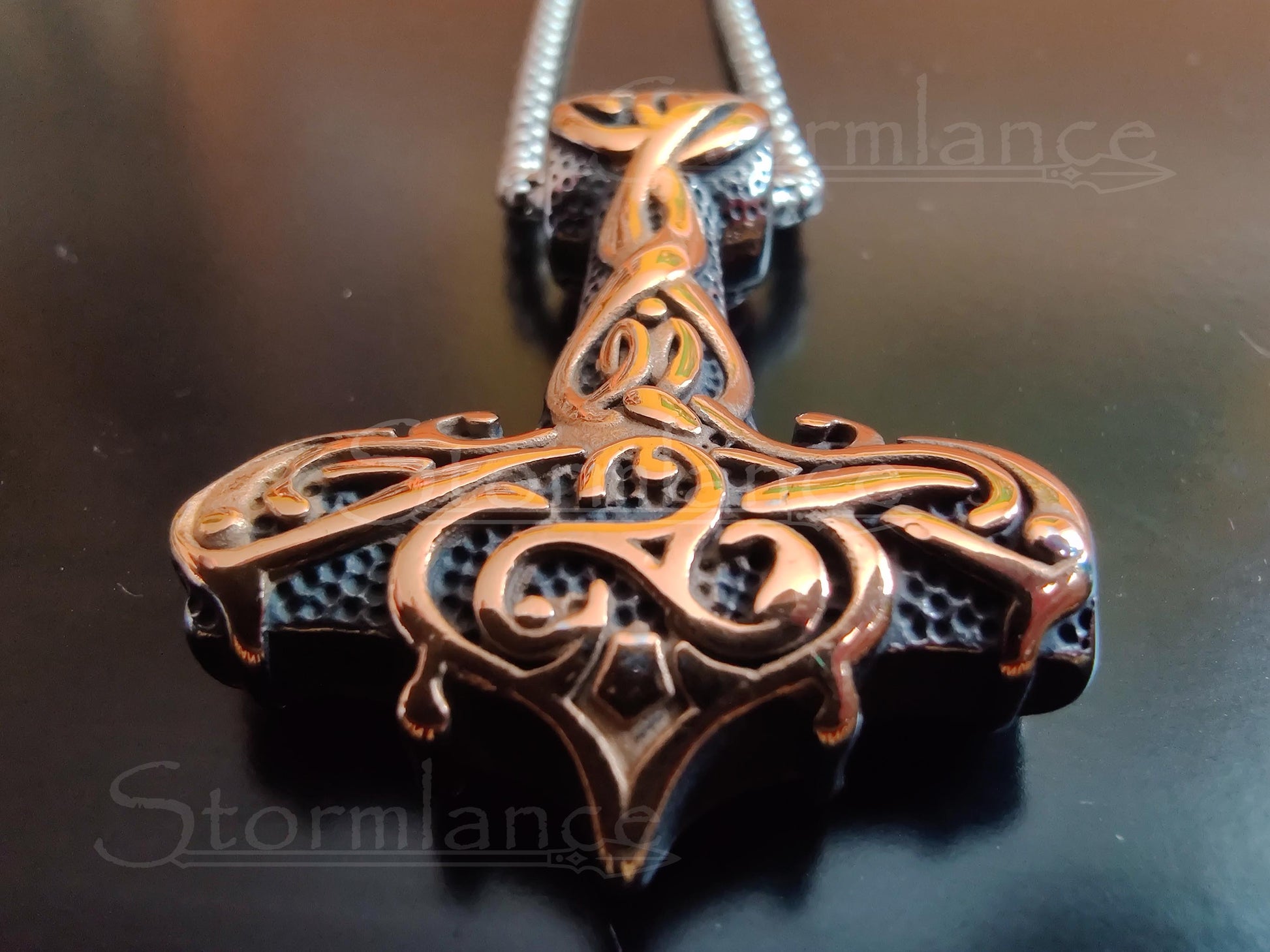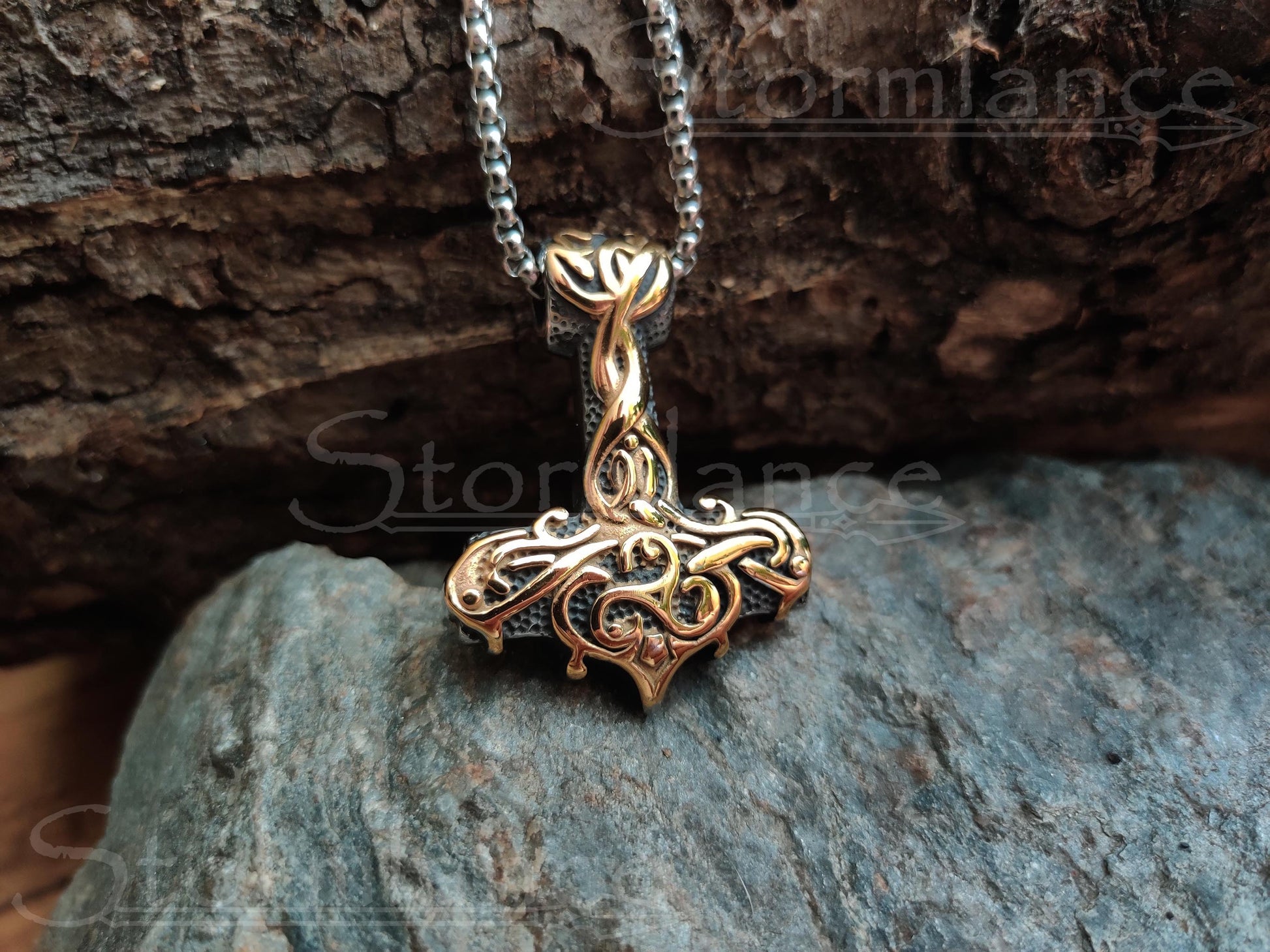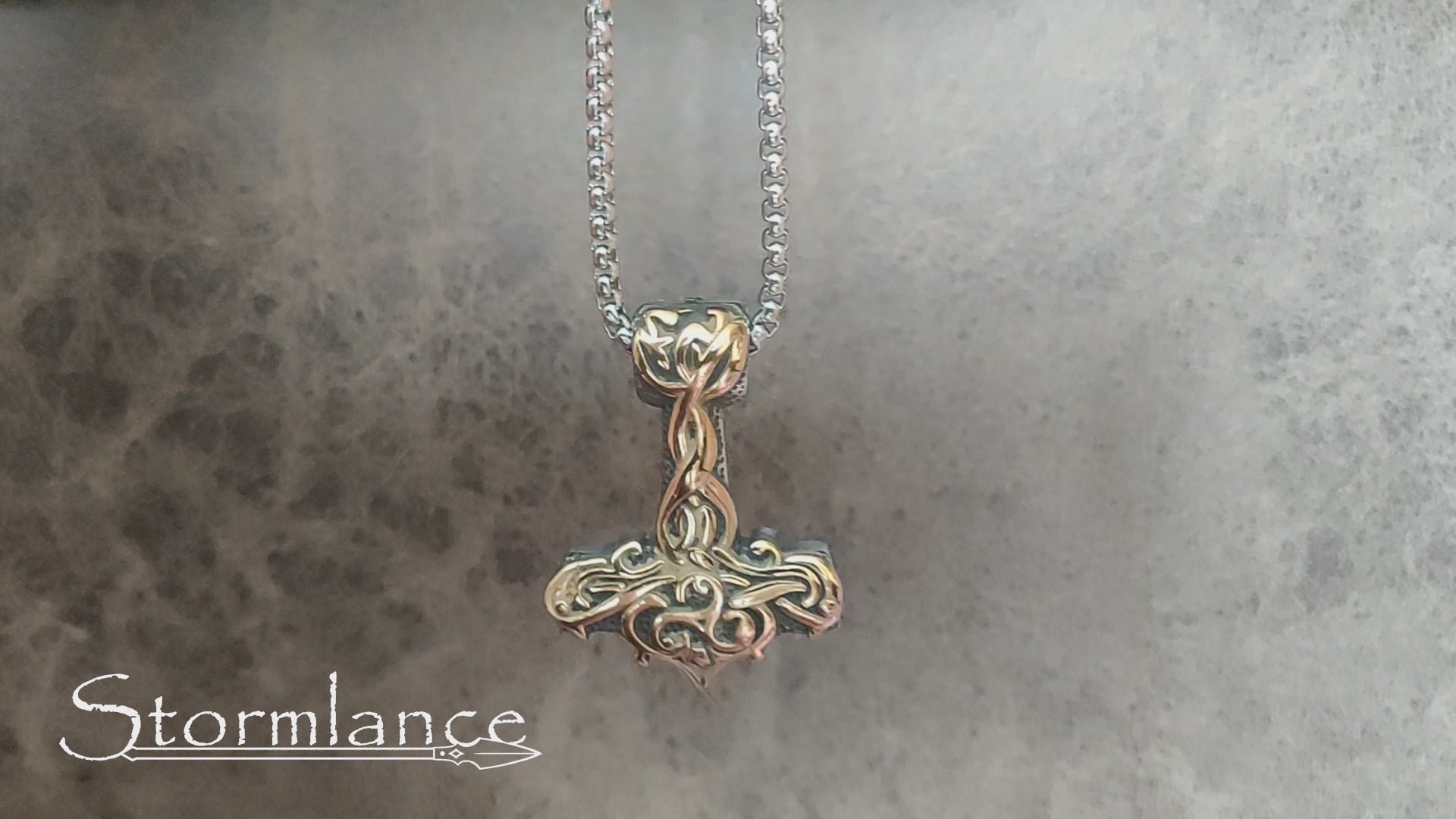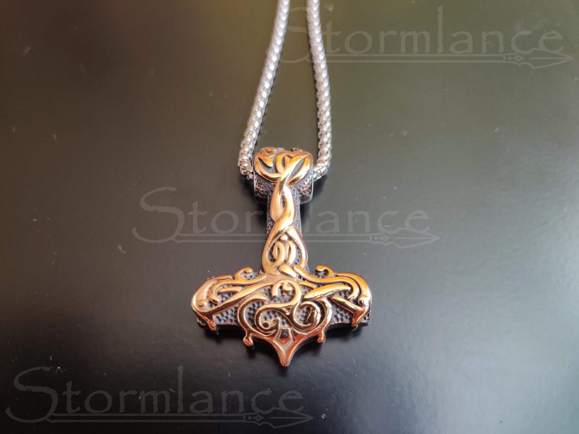 Behold the beauty of this magnificent Mjolnir pendant. This beautiful piece is made of high-quality stainless steel and is gold-plated. The intricate Scandinavian design will catch the eye of onlookers and Gods alike.