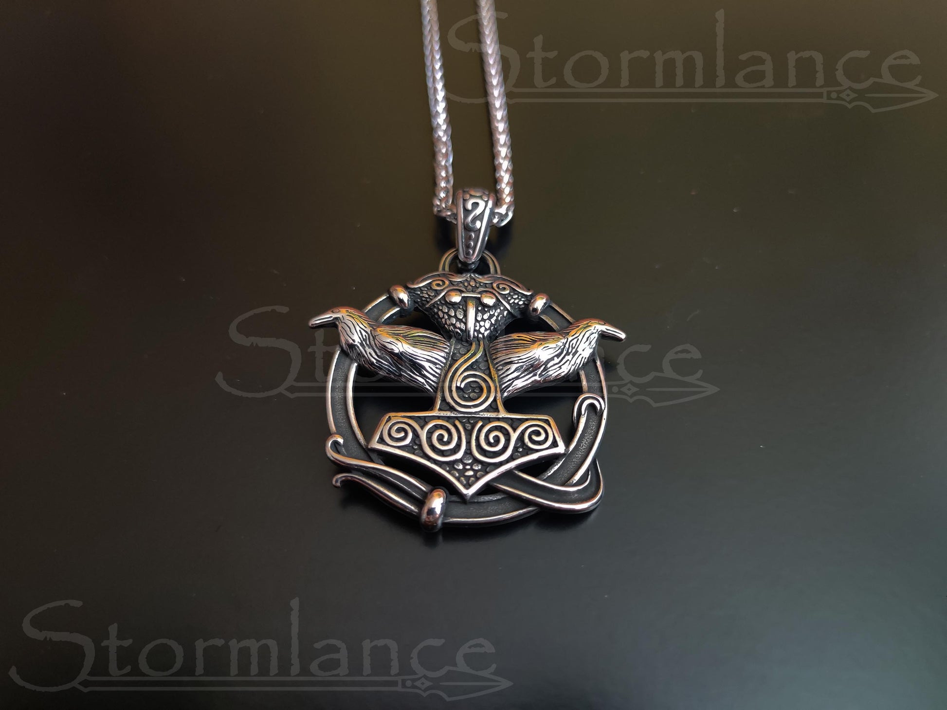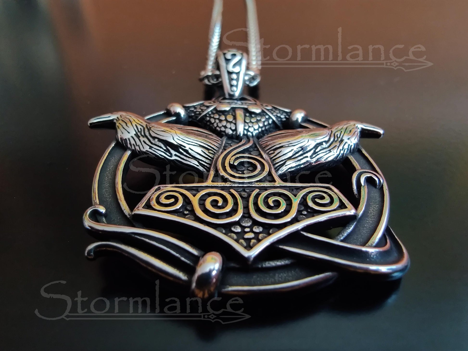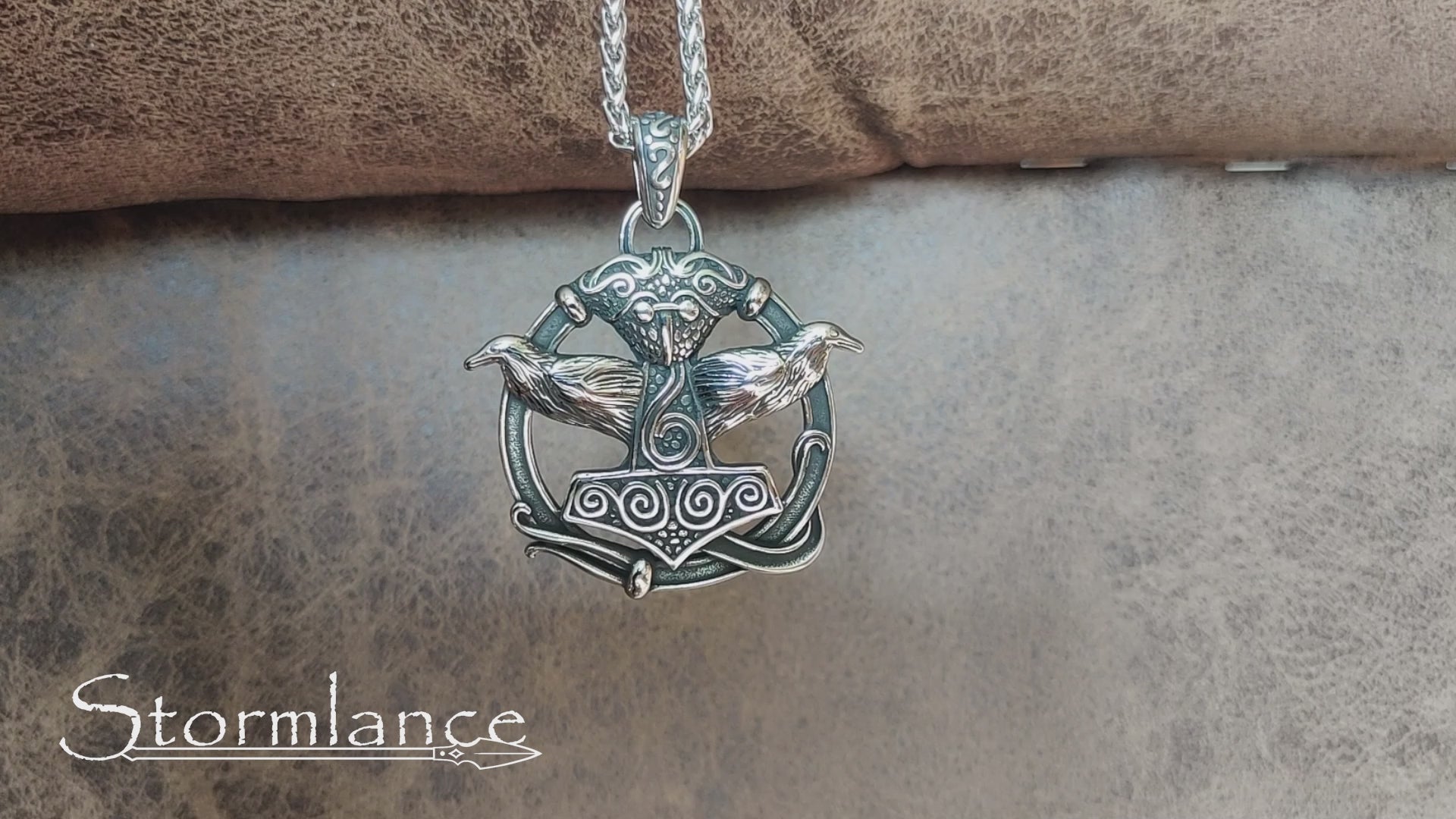 Large, beautiful amulet of Thor's Hammer that is being guarded by Odin's ravens, Huginn and Muninn.