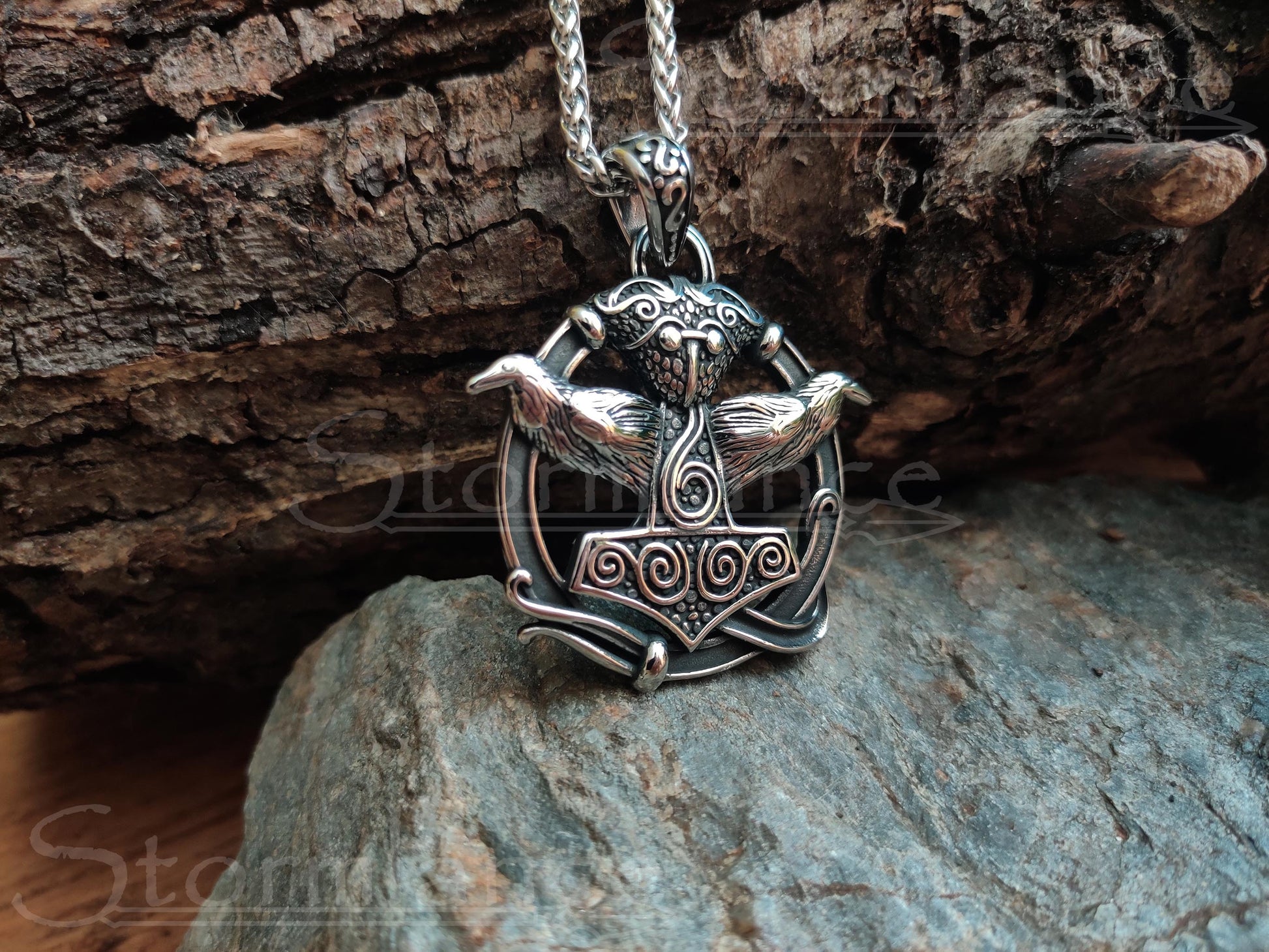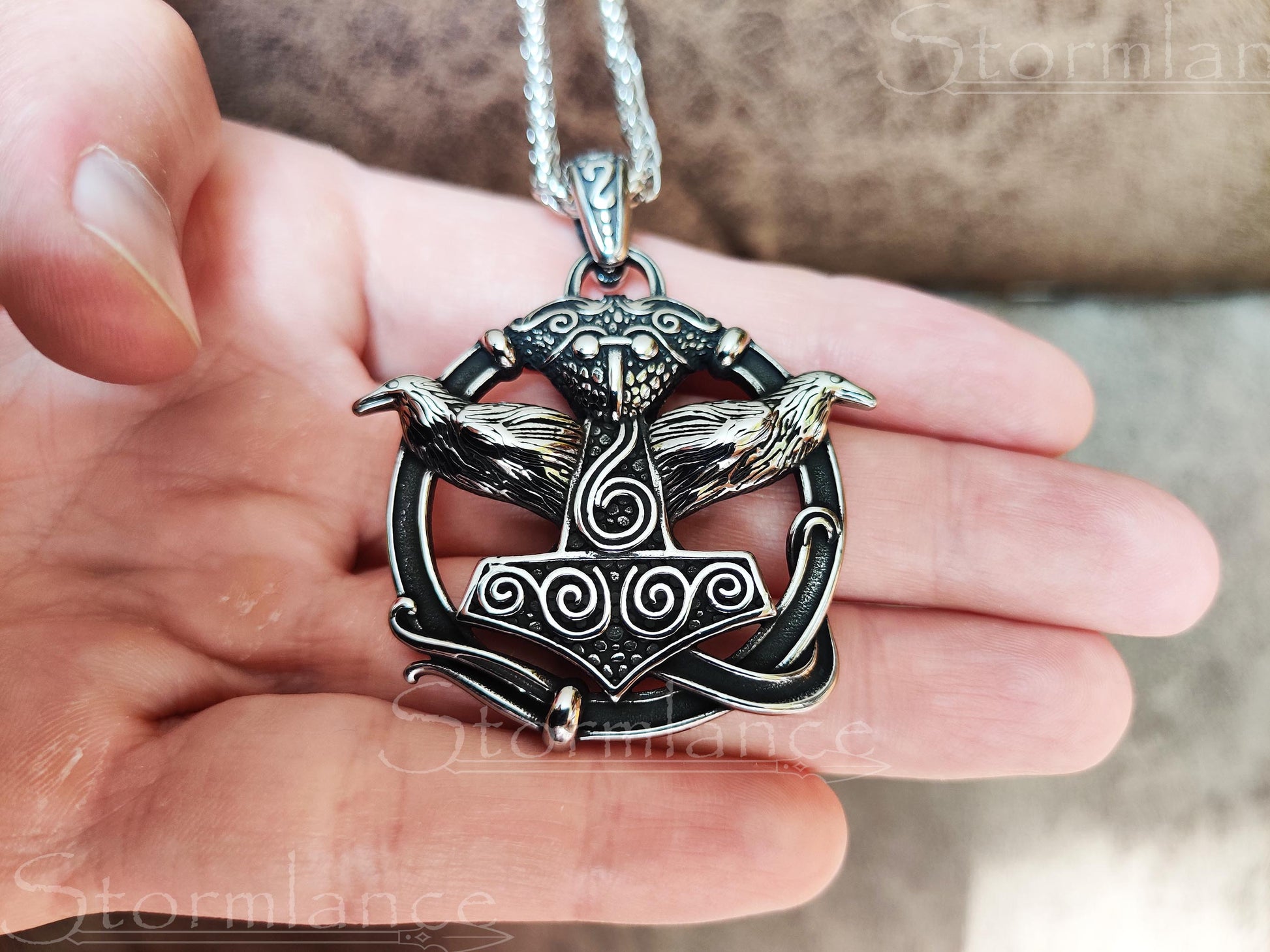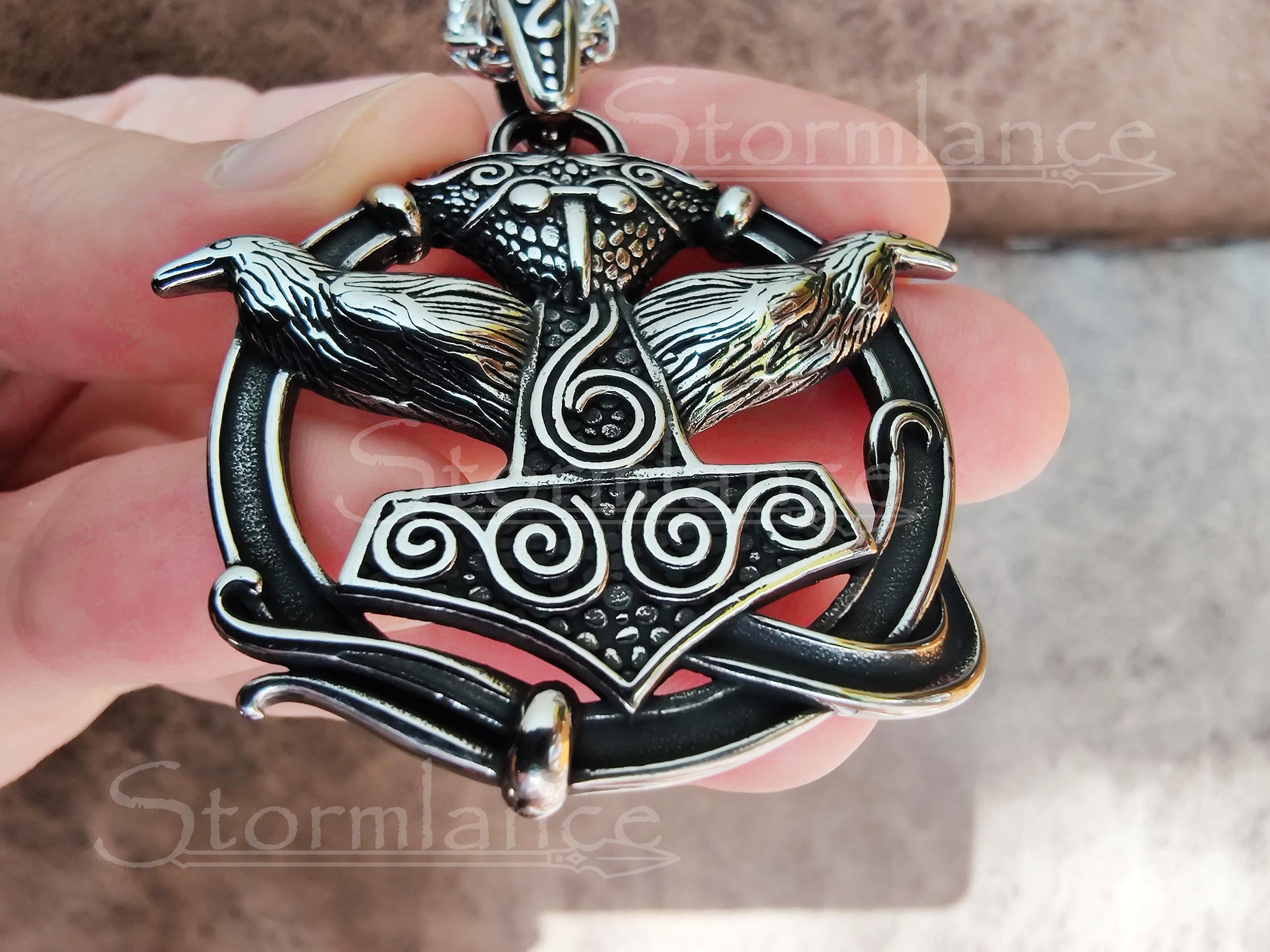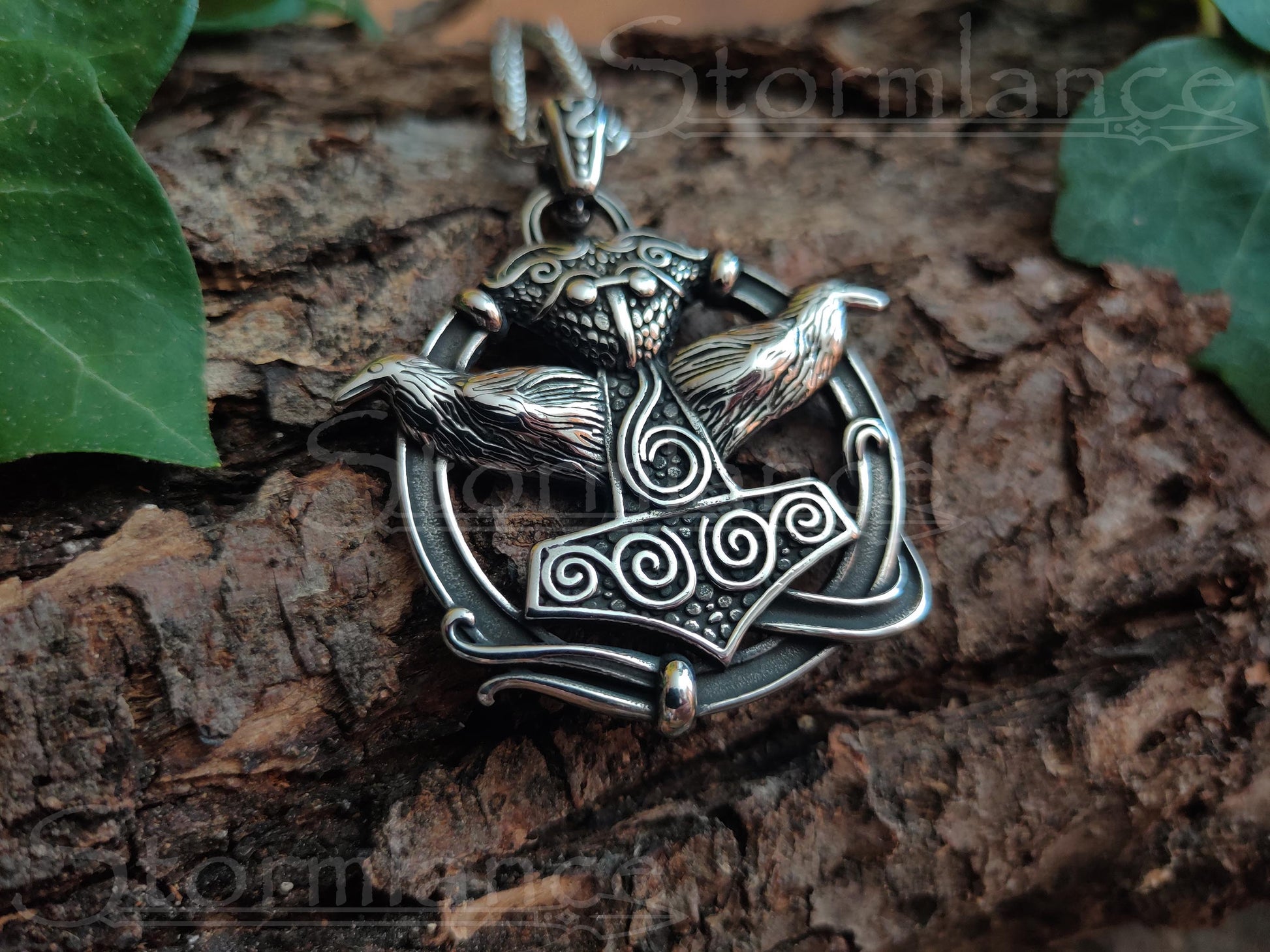 Large, beautiful amulet of Thor's Hammer that is being guarded by Odin's ravens, Huginn and Muninn.