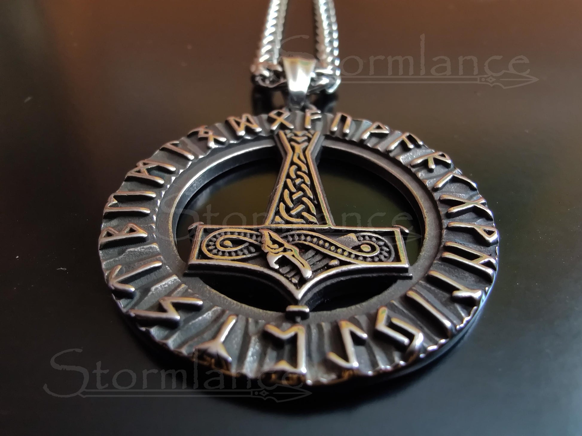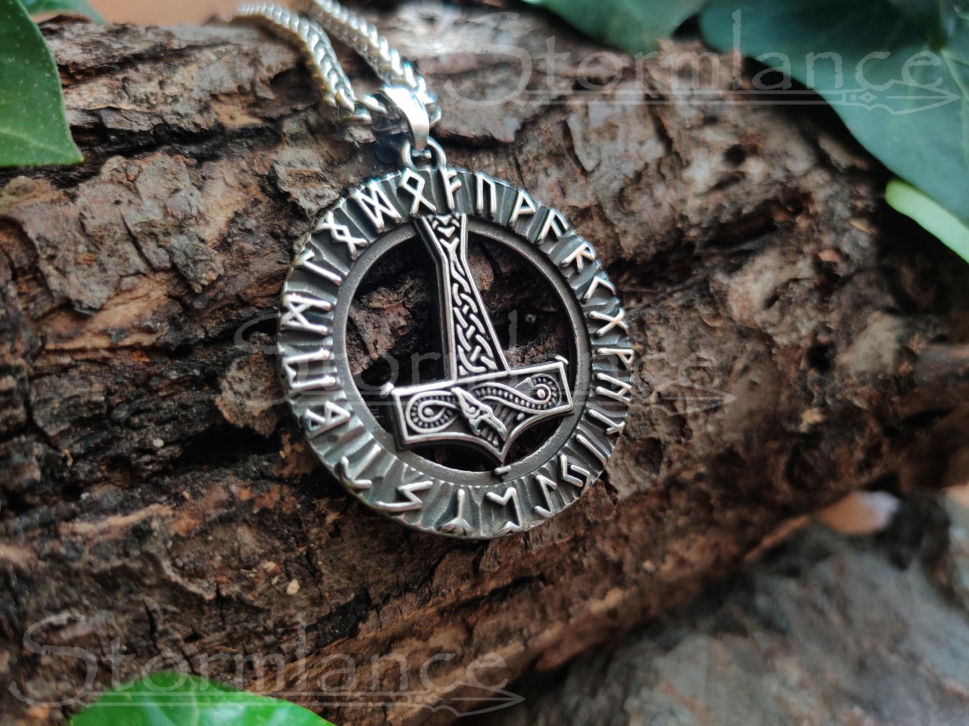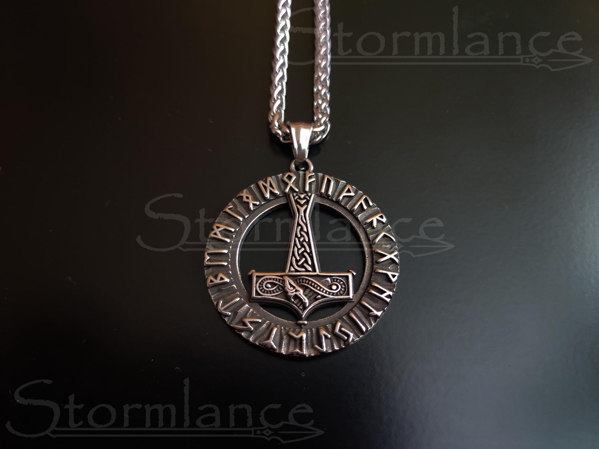 Mjolnir (Thor's hammer), encircled by Norse Runes (Elder Futhark) pendant.