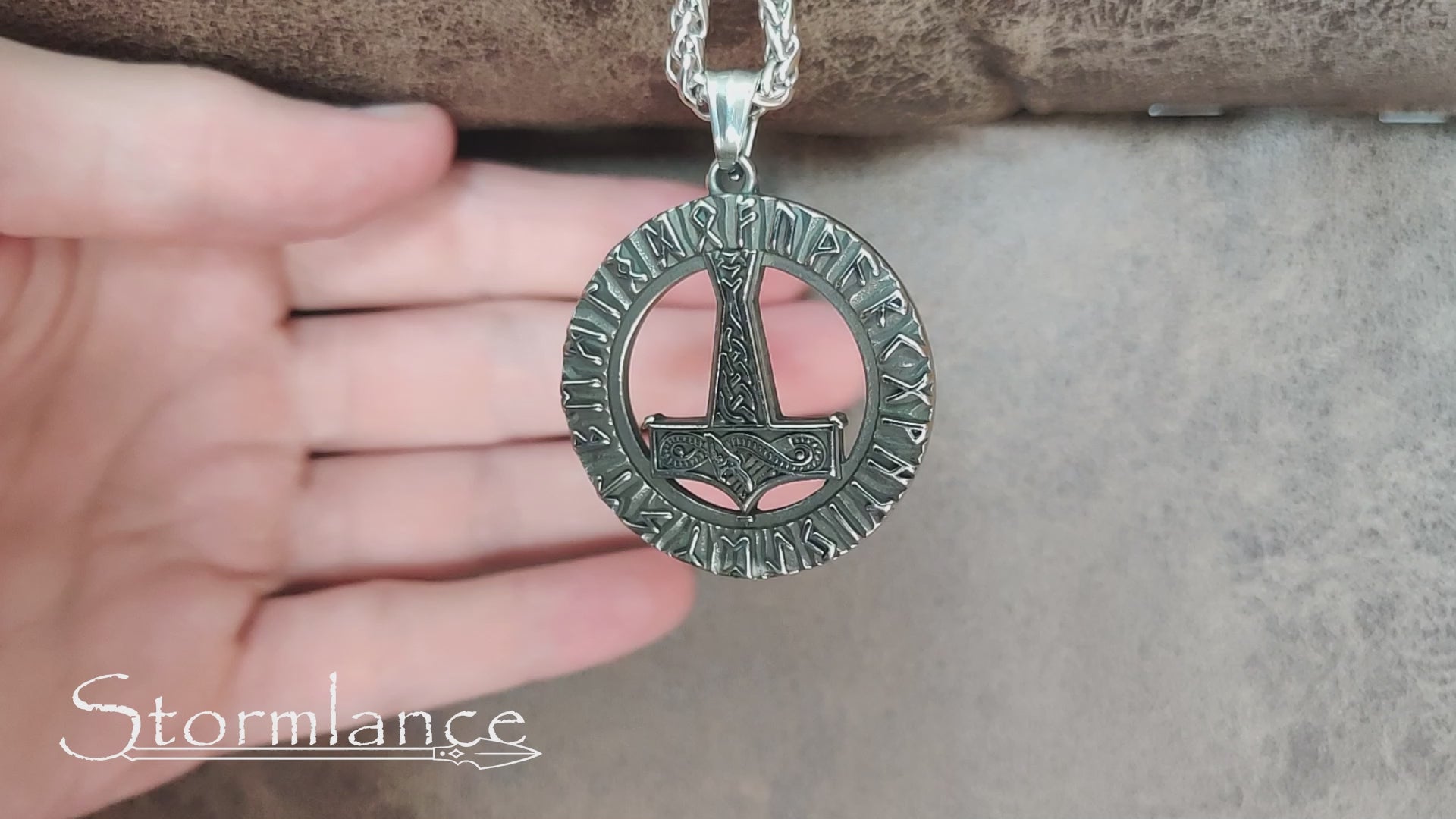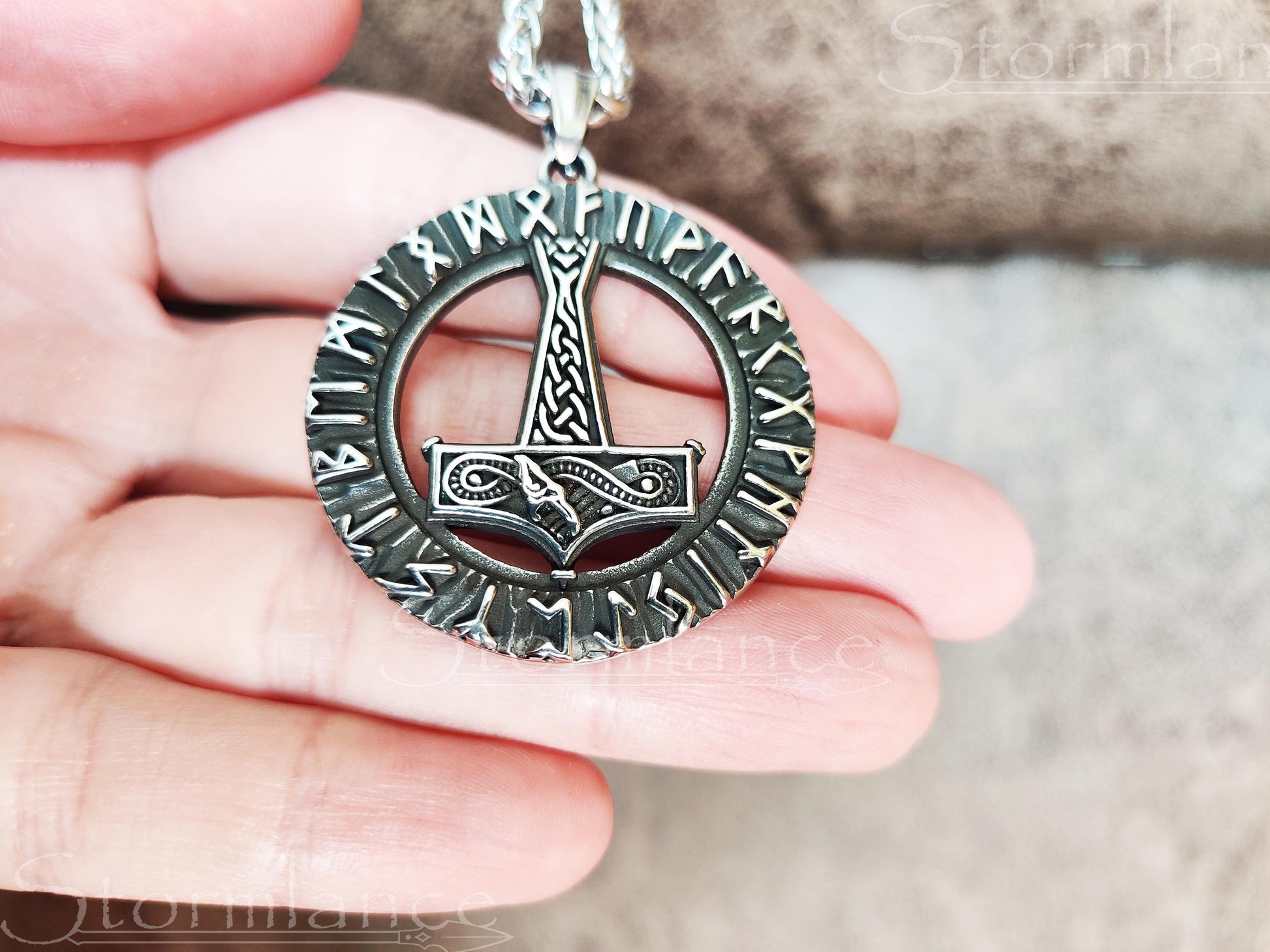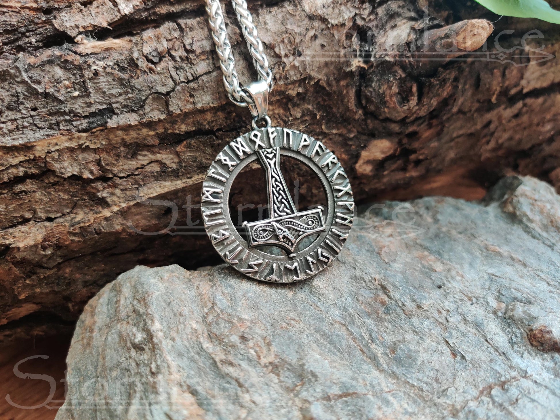 Mjolnir (Thor's hammer), encircled by Norse Runes (Elder Futhark) pendant.
