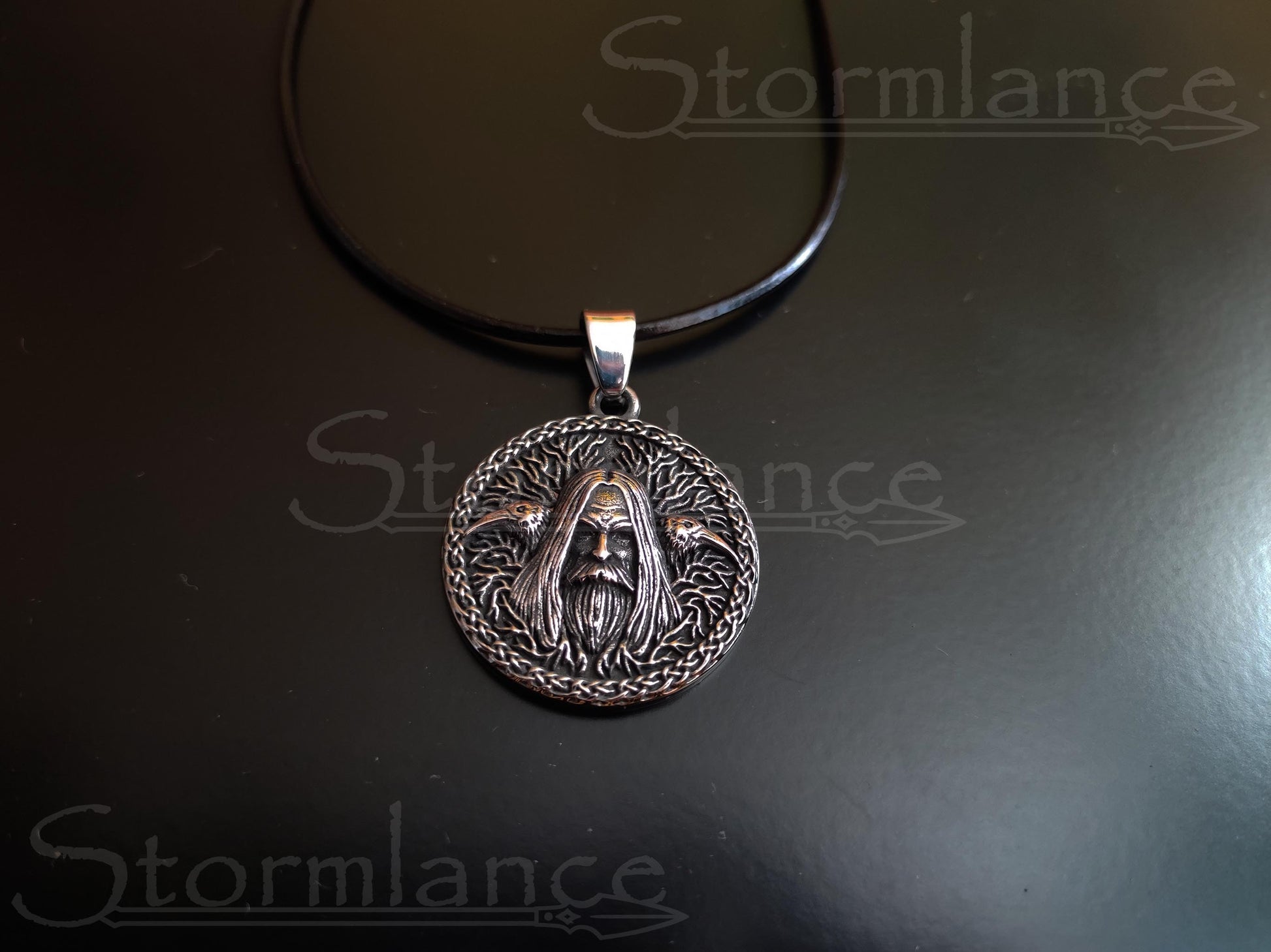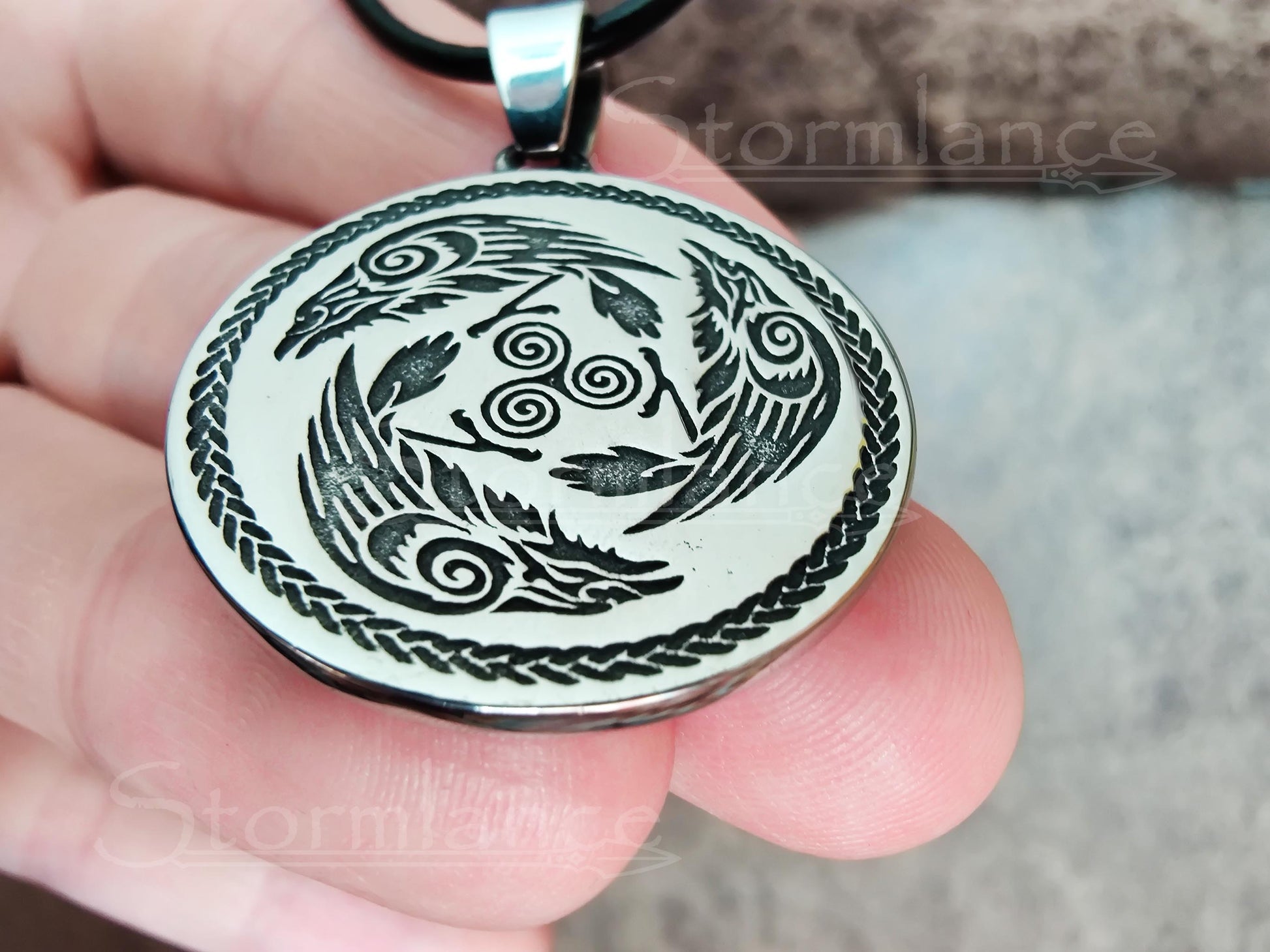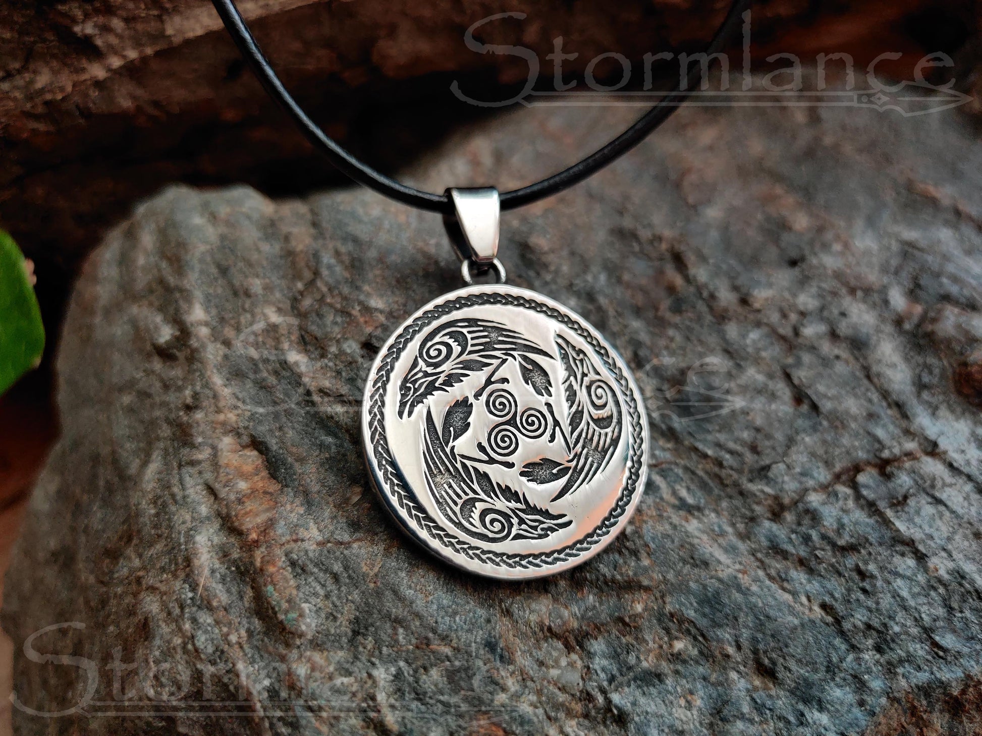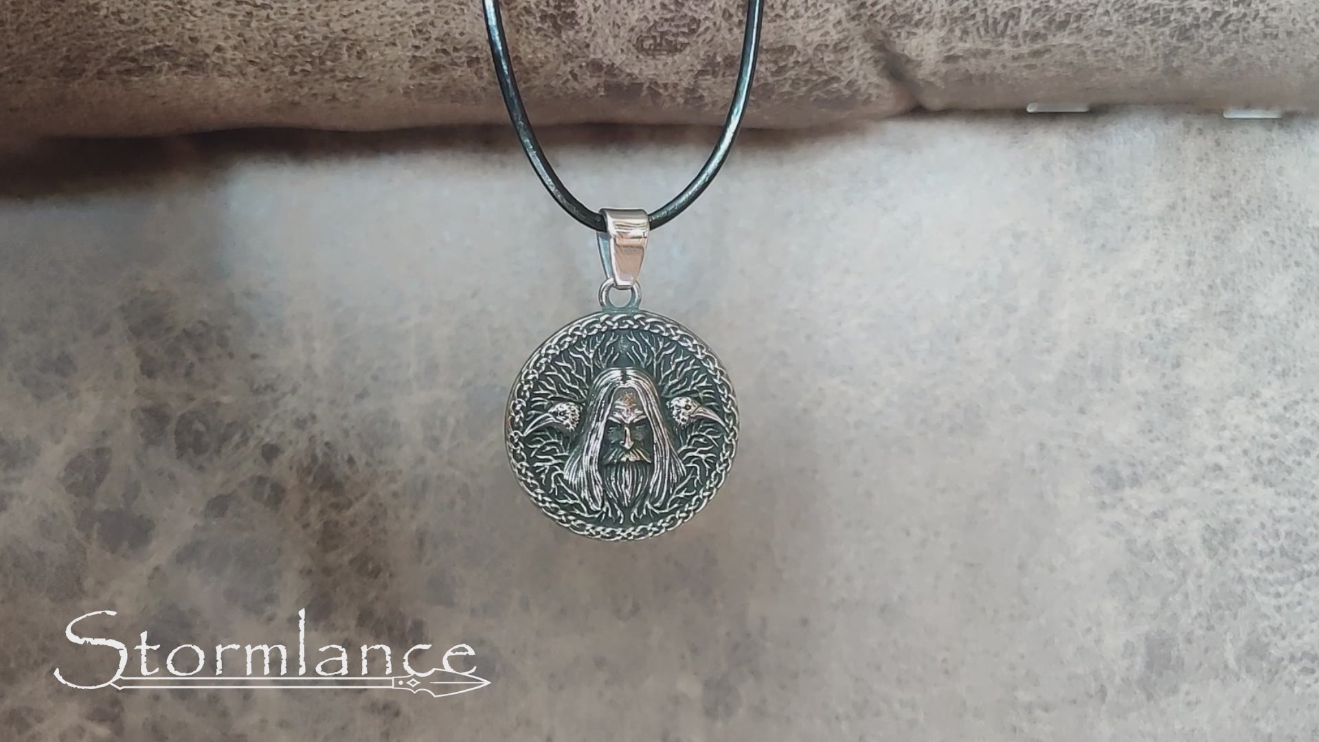 A beautiful Odin pendant with his ravens, Huginn and Muninn. On the other side of the pendant are three circling ravens with Triskelion in the middle.