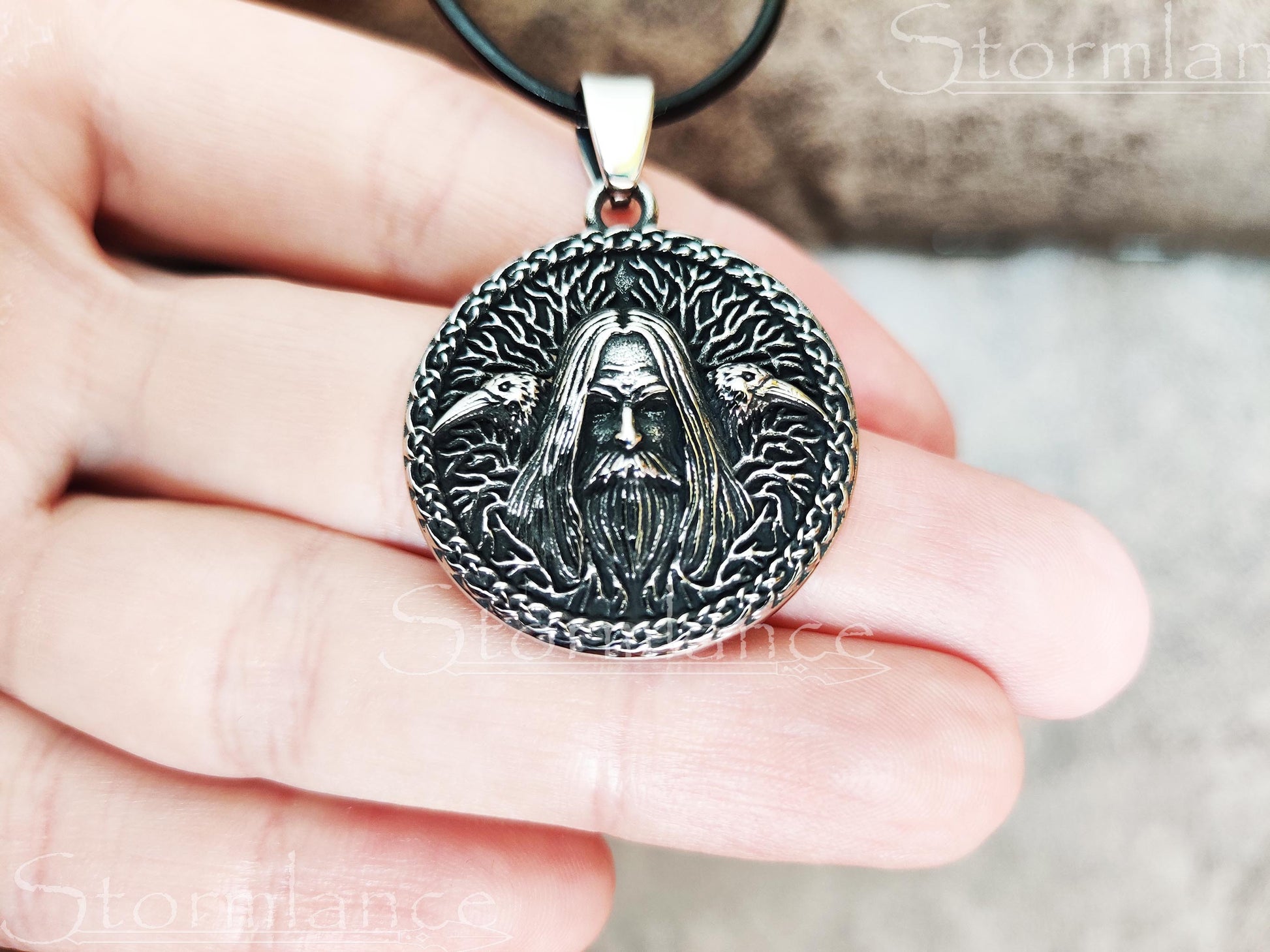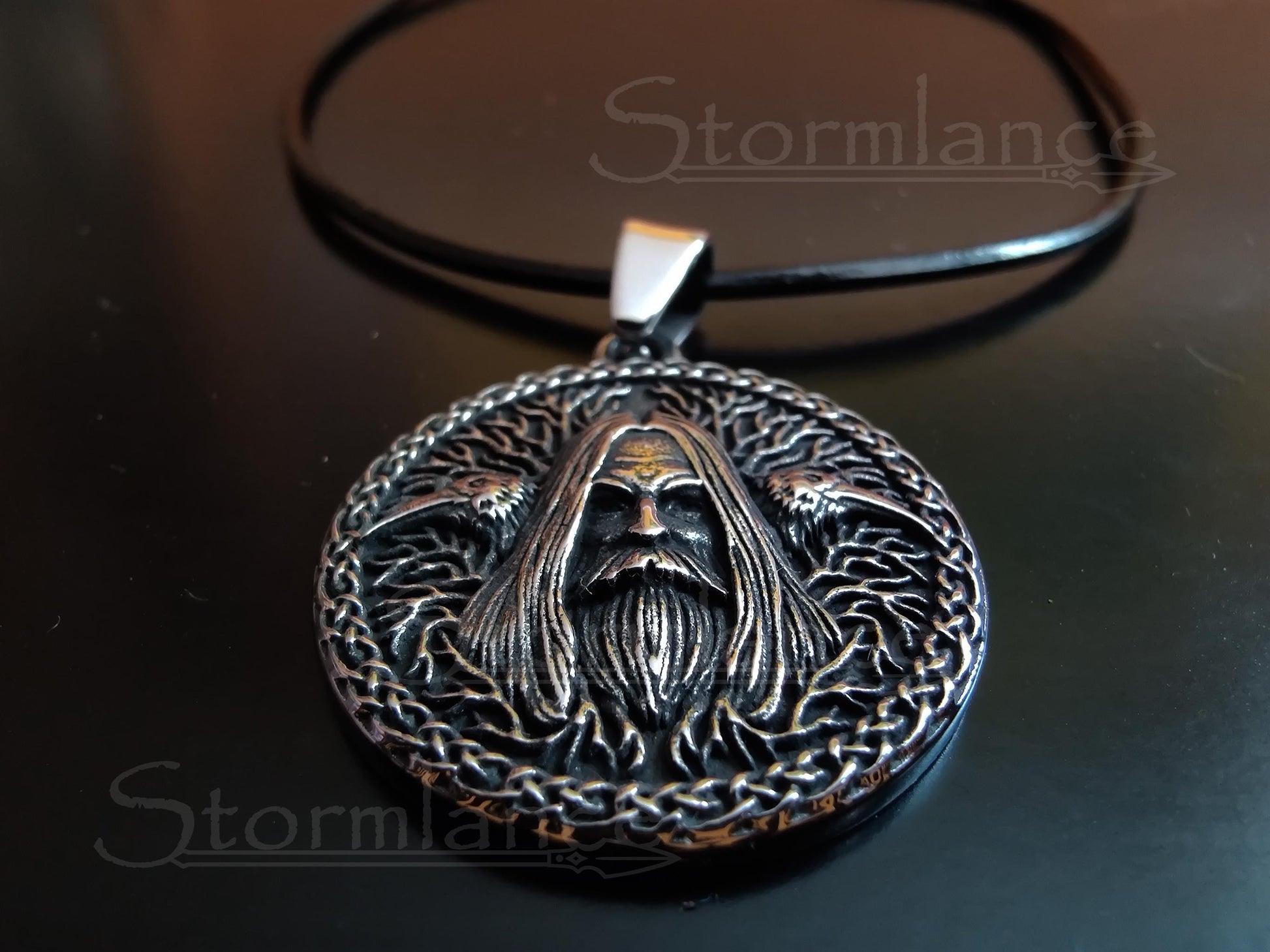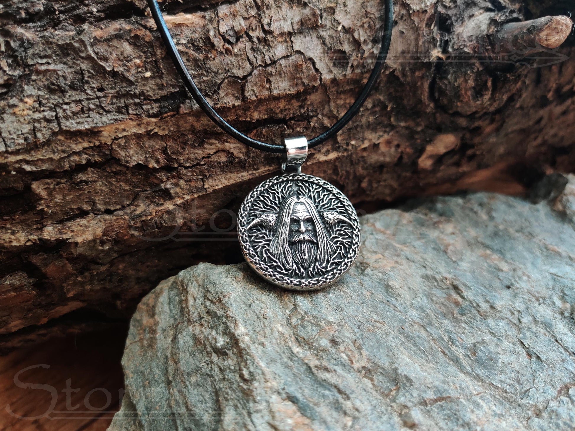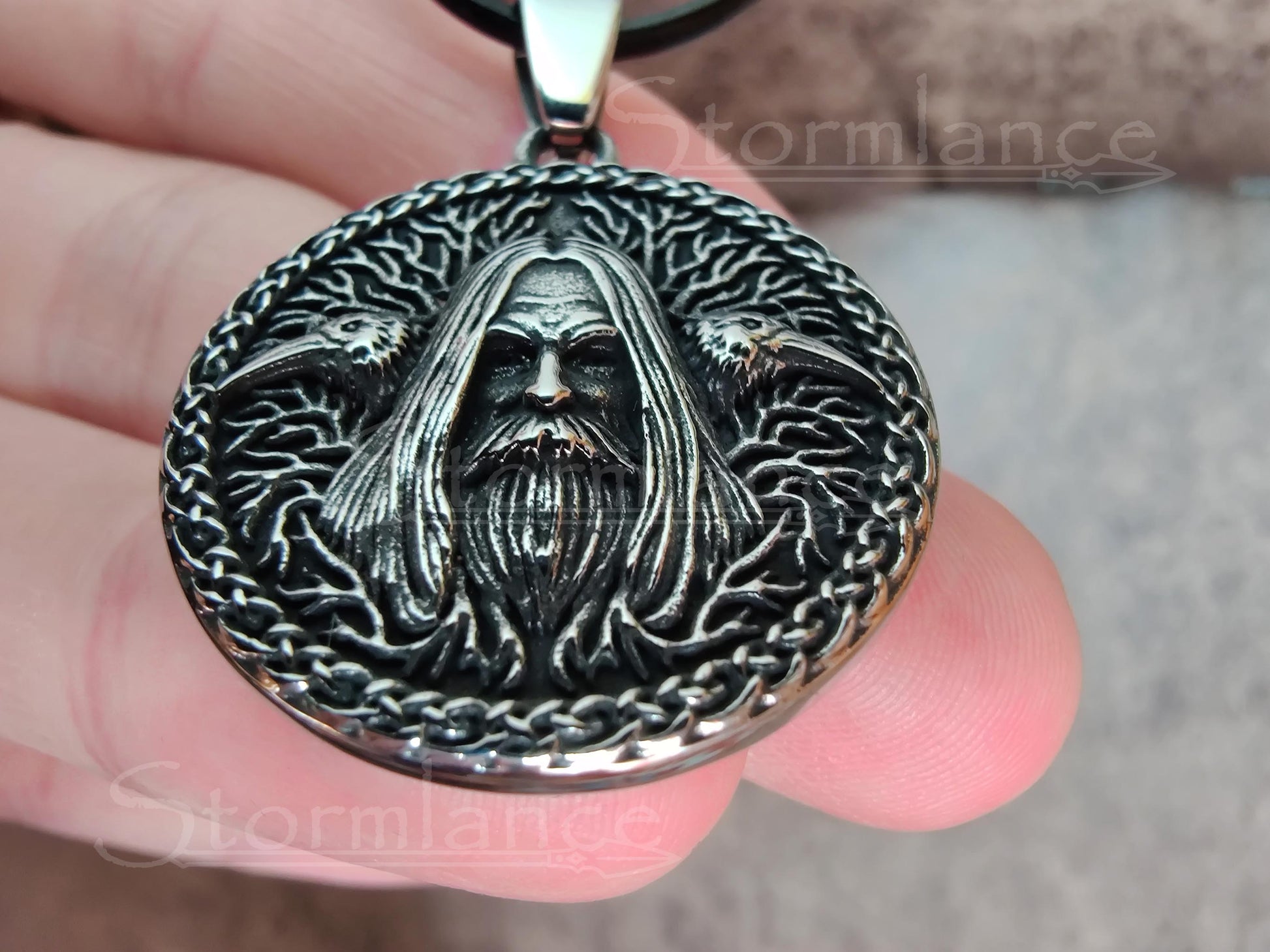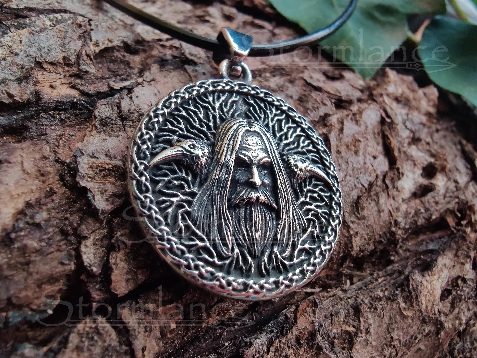 A beautiful Odin pendant with his ravens, Huginn and Muninn. On the other side of the pendant are three circling ravens with Triskelion in the middle.